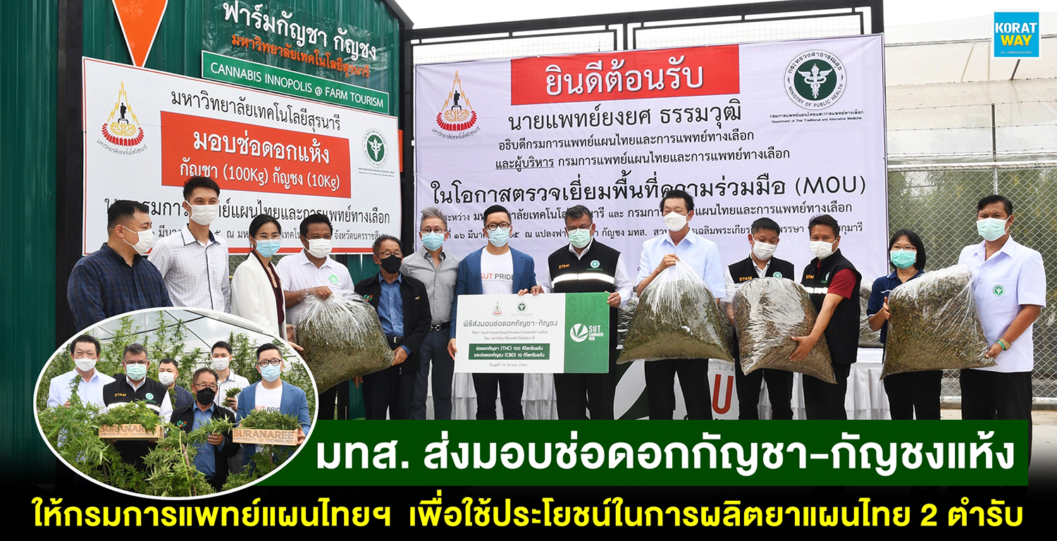 มหาวิทยาลัยเทคโนโลยีสุรนารี (มทส.) ส่งมอบช่อดอกกัญชา-กัญชงแห้ง กว่า 100 กิโลกรัม ให้กรมการแพทย์ แผนไทยฯ เพื่อนำไปใช้ประโยชน์ตามกระบวนการผลิตยาแผนไทย 2 ตำรับ พร้อมเปิดคลังวัตถุดิบกลางเก็บผลผลิต และเปิดพื้นที่ 28 ไร่ ขยายโรงเรือนปลูกมาตราฐาน 50 โรง รองรับเครือข่ายวิสาหกิจชุมชนรายใหญ่และรายย่อยจากทั่วประเทศที่มีความร่วมมือเข้ารับการถ่ายทอดเทคโนโลยีด้านกัญชาจาก มทส. อย่างครบวงจรแห่งแรกของประเทศ