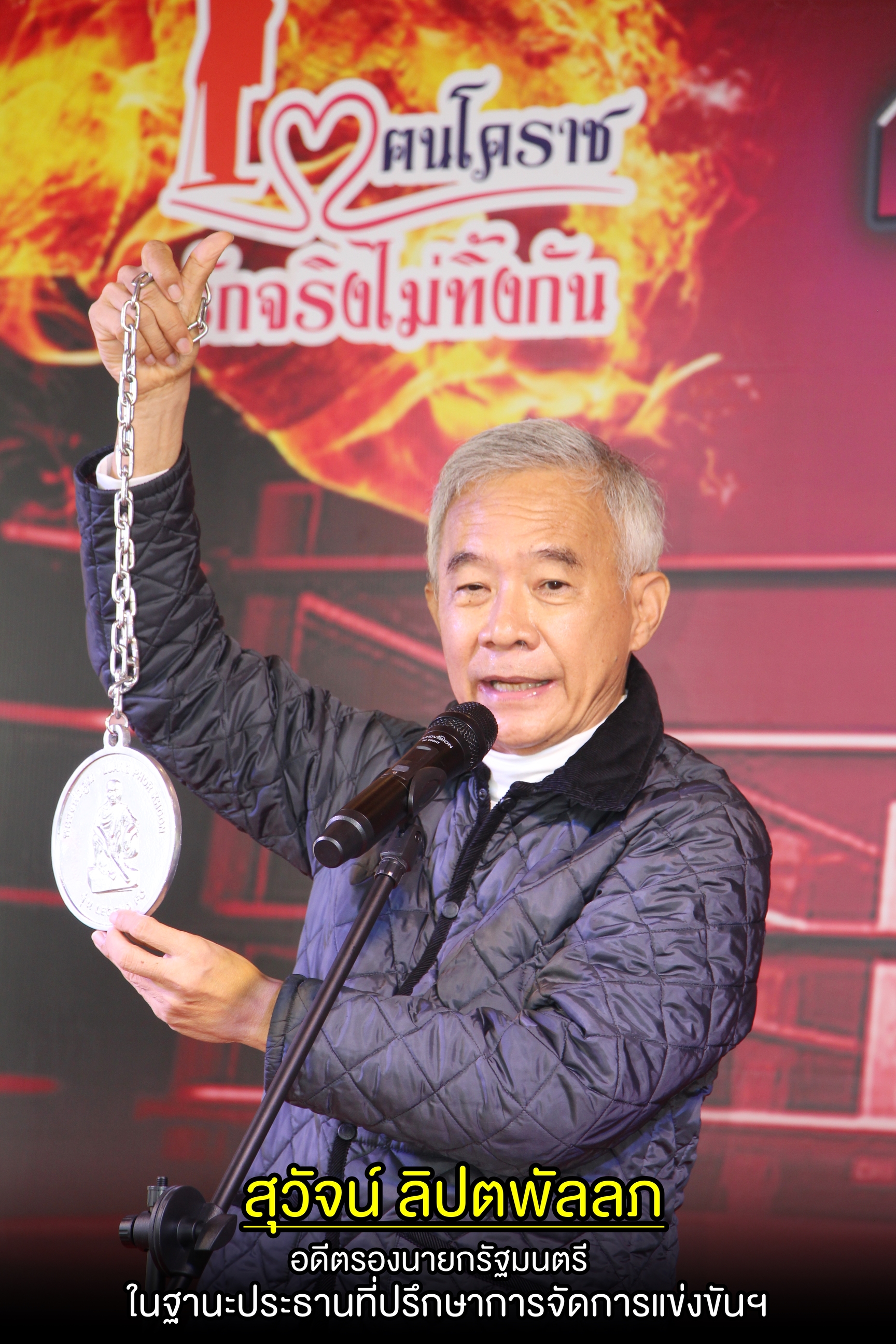 ฯพณฯ สุวัจน์ ลิปตพัลลภ อดีตรองนายกรัฐมนตรี ในฐานะประธานที่ปรึกษาการจัดการแข่งขันฯ เป็นประธานแถลงข่าวการแข่งขันกีฬามวยไทย และศิลปะการต่อสู้แบบผสมผสาน (MMA) รายการ เลเจนด์ เอฟซี “คนโคราชรักจริงไม่ทิ้งกัน” ณ ศาลาทรงไทย ลานอนุสาวรีย์ท้าวสุรนารี (ย่าโม) อ.เมือง จ.นครราชสีมา เมื่อวันที่ 26 ส.ค. 65 ท่ามกลางบรรยากาศที่คึกคักจากชาวโคราชที่มาร่วมฟังการแถลงด้วย