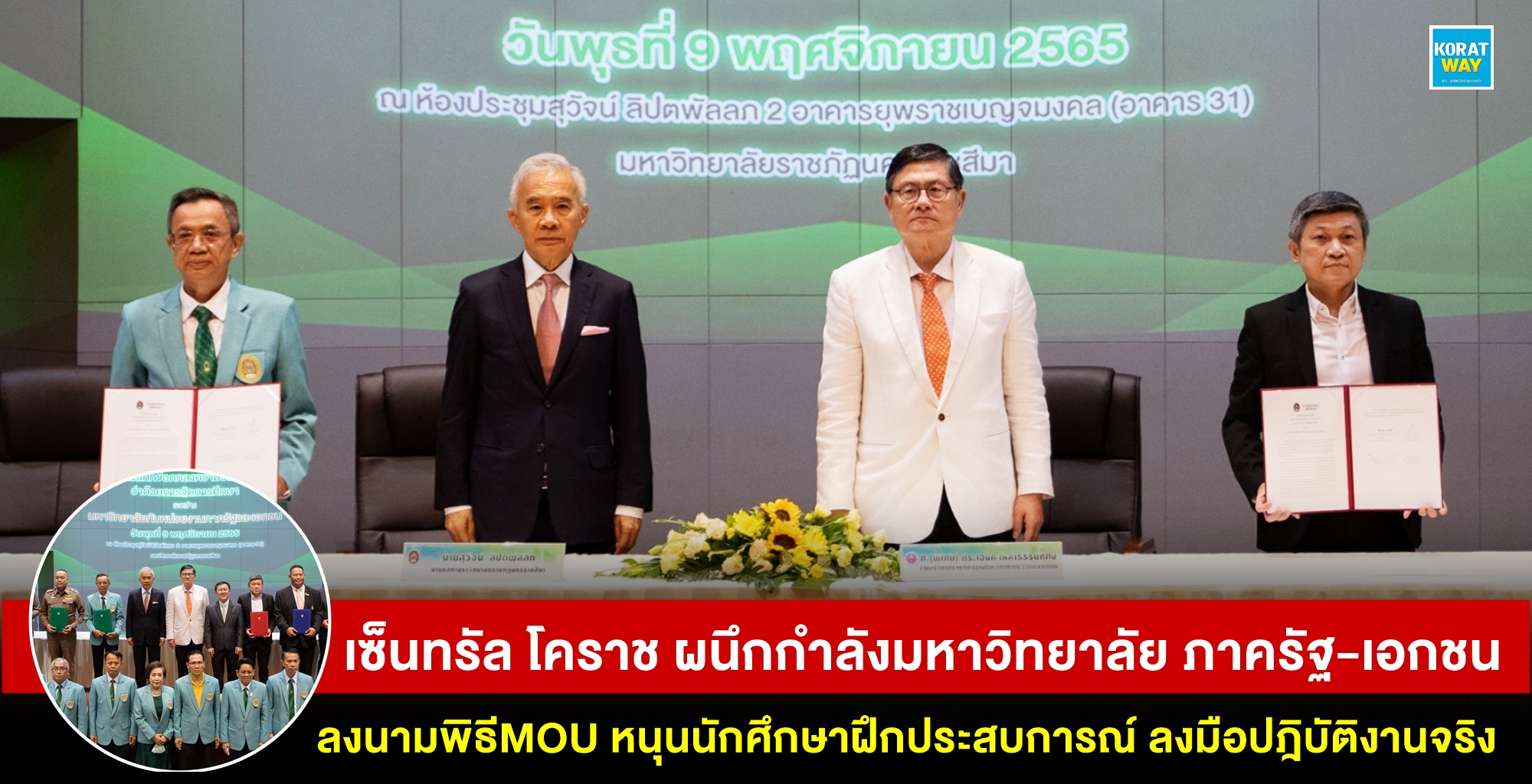 วันที่ 9 พ.ย 65 ณ ห้องประชุมสุวัจน์ ลิปตพัลลภ 2 อาคารยุพราชเบญจมงคล มหาวิทยาลับราชภัฎนครราชสีมา ศาสตราจารย์พิเศษ ดร. เอนก เหล่าธรรมทัศน์ รัฐมนตรีว่าการกระทรวงการอุดมศึกษา วิทยาศาสตร์ วิจัยและนวัตกรรม เป็นประธานในพิธีลงนามบันทึกข้อตกลงความร่วมมือ (MOU) ว่าด้วยการจัดการศึกษา ระหว่างมหาวิทยาลัยกับหน่วยงานภาครัฐและเอกชน พร้อมด้วยคุณสุวัจน์ ลิปตพัลลภ นายกสภามหาวิทยาลัยราชภัฏนครราชสีมา คุณศุภภิมิตร เปาริก รองผู้ว่าราชการจังหวัดนครราชสีมา คุณสุริยาตันเจริญ ผู้จัดการทั่วไปศูนย์การค้าเซ็นทรัลโคราช ผู้ช่วยศาสตราจารย์ ดร.อดิศร เนาวนนท์ อธิการบดีมหาวิทยาลัยราชภัฏนครราชสีมาและอธิการบดี รวมถึงข้าราชการ นักวิชาการผู้เข้าร่วมงานในครั้งนี้เป็นจำนวนมาก