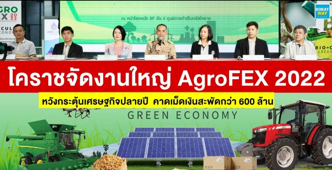 “Agro FEX 2022” จัดขึ้นใน วันที่ 1 – 4 ธันวาคม 2565 ณ Korat Hall ชั้น 4 ศูนย์การค้าเซ็นทรัล โคราช เป็นความร่วมมือของ สภาอุตสาหกรรมจังหวัดนครราชสีมา บูรณาการร่วมกับหลายหน่วยงาน ในกิจกรรม แสดงนิทรรศการ การบรรยายให้ความรู้ การจับคู่ธุรกิจ การเซ็น MOU ซึ่งมีความร่วมมือ จากหลายฝ่าย เช่น จังหวัดนครราชสีมา สนับสนุนการจัดงานอันเป็นกิจกรรม Mice city , สำนักงานส่งเสริมการจัดประชุมและนิทรรศการ หรือ TCEB สนับสนุนงบประมาณบางส่วน , กระทรวงพาณิชย์ โดยท่านรมต.จุรินทร์ ลักษณะวิศิษฐ์ ให้เกียรติมาเป็นประธานเปิดงานทุกปีรวมถึงปีนี้ด้วย ได้จัด business matching ผ่านสำนักงาน ฑูตพาณิชย์ในตปท. , มหาวิทยาลัยเทคโนโลยีสุรนารี (มทส.) สนับสนุนงบประมาณ และงานวิจัยมาจัดแสดง , BOI ให้ความรู้ เรื่องส่งเสริมการลงทุนตามนโยบาย BCG รวมทั้งการจับคู่ธุรกิจ ,ศูนย์การค้าเซ็นทรัล โคราช เอื้อเฟื้อสถานที่จัดงานในราคาพิเศษ , สภาอุตสาหกรรมแห่งประเทศไทย โดย คุณเกรียงไกร ชาญนุกูล ที่จะนำทีมมาโคราช บรรยาย จัดนิทรรศการ จับคู่ธุรกิจ ประชุมสภาภาคอีสาน และดูงาน , สำนักงานอุตสาหกรรมจังหวัดนครราชสีมา จัดการบรรยายให้ความรู้เรื่องการจัดการสวล. งานนิทรรศการ และ คลีนิกให้คำปรึกษา , สวทช สนง.นวัตกรรมแห่งชาติ และเครือข่าย11 องค์กรภาคเอกชน , ชมรมธนาคาร นำ booth มานำเสนอ Green Financing แก่นักอุตสาหกรรม และมีทีมโซล่าชุมชน มาจัดแสดงและการสาธิตใช้อุปกรณ์ไฟฟ้า อิเล็กทรอนิกส์ อีกด้วย