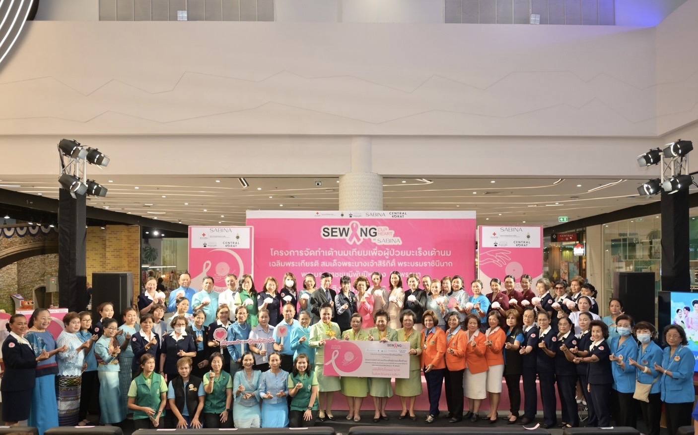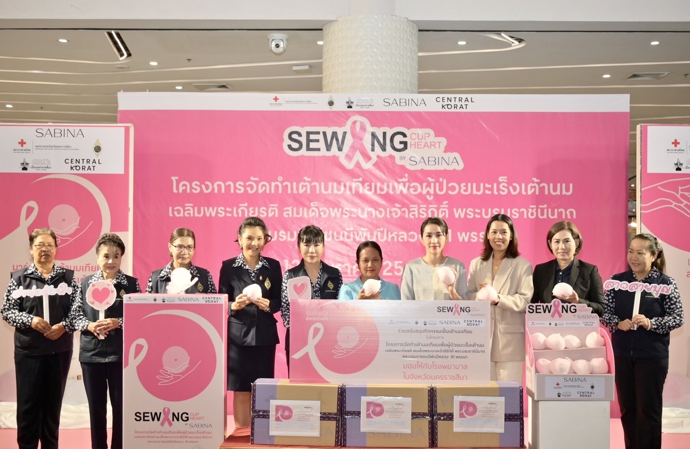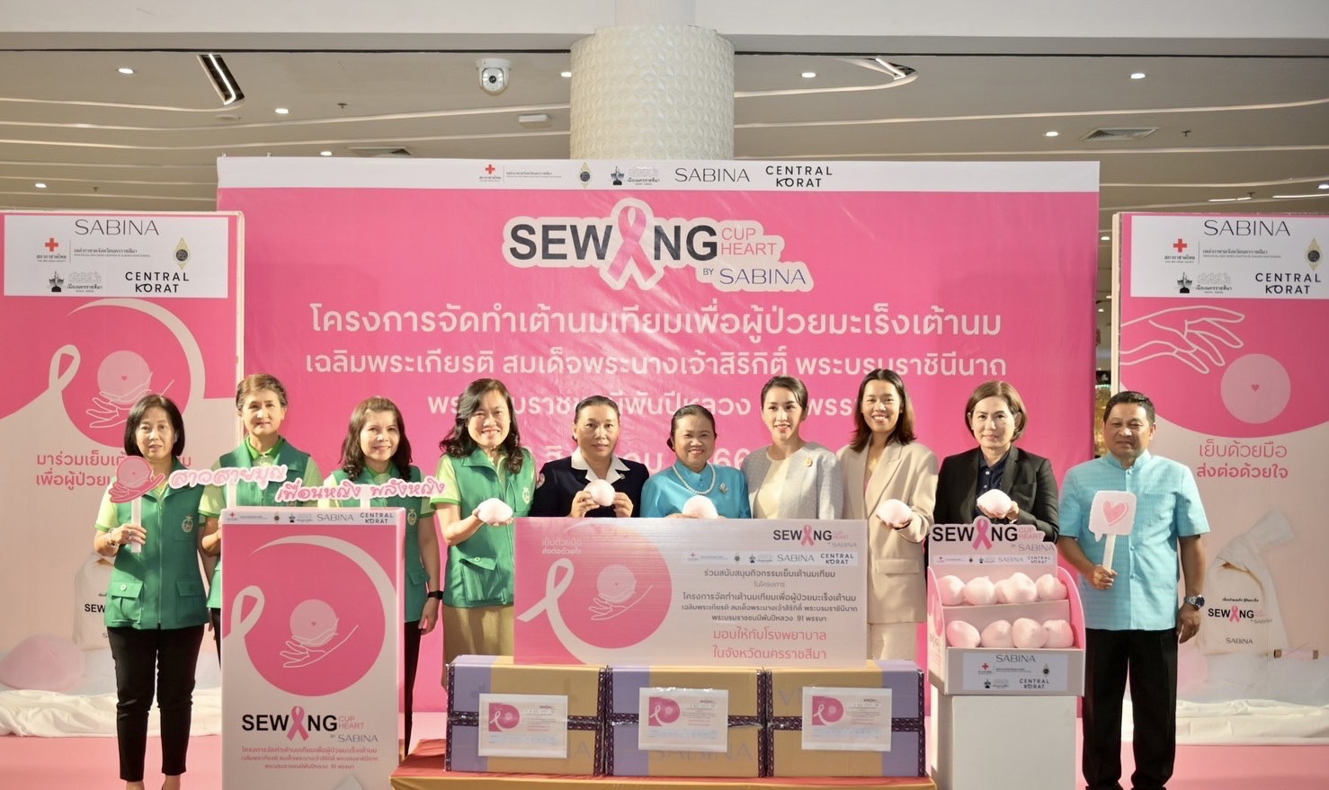 พร้อมด้วยคุณสุฐิดา วิริยะกุลนันท์ รองนายกเหล่ากาชาดจังหวัดนครราชสีมา คุณสินีนาฎ ทองสุข รองนายกเหล่ากาชาดจังหวัดนครราชสีมา คุณวีราภรณ์ เนตรคง ผู้จัดการฝ่ายขาย บริษัท ซาบีน่า จำกัด (มหาชน) คุณนิสา ชาภู่พวง ผู้จัดการทั่วไปศูนย์การค้าเซ็นทรัล โคราช และแขกผู้มีเกียรติทั้งหน่วยงานภาครัฐและภาคเอกชน ร่วมมอบเต้านมเทียมอย่างพร้อมเพียงกัน
