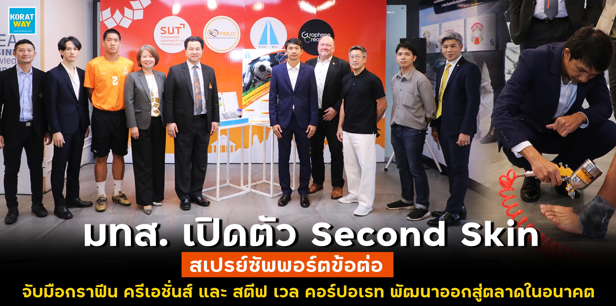 โครงการแพลตฟอร์มบ่มเพาะและเร่งสร้างเติบโตนวัตกรรมเชิงลึก ม.เทคโนโลยีสุรนารี (SUT Horizon) เปิดตัว Second Skin นวัตกรรมวัสดุศาสตร์ที่คิดค้นมาจากนักศึกษาที่รักในการเล่นฟุตบอลร่วมกับการวิจัยพัฒนาวัสดุกราฟีน ได้ออกแบบผลิตภัณฑ์เป็นสเปรย์เพื่อฉีดพ่นข้อเท้า (Non-woven fabric) เส้นใยจะห่อหุ้มรอบ ๆ ข้อและแห้งในทันที ก่อนสวมถุงเท้าและรองเท้าเล่นกีฬาอย่างเช่น นักกีฬาฟุตบอล บาสเก็ตบอล วิ่ง เทนนิส วอลเลย์บอล ที่ต้องล็อคข้อเท้าด้วยเทปพันอยู่เสมอ ให้สามารถใช้งานสะดวกมากขึ้น เพื่อลดความเสี่ยงการบาดเจ็บที่อาจเกิดขึ้นระหว่างกิจกรรม