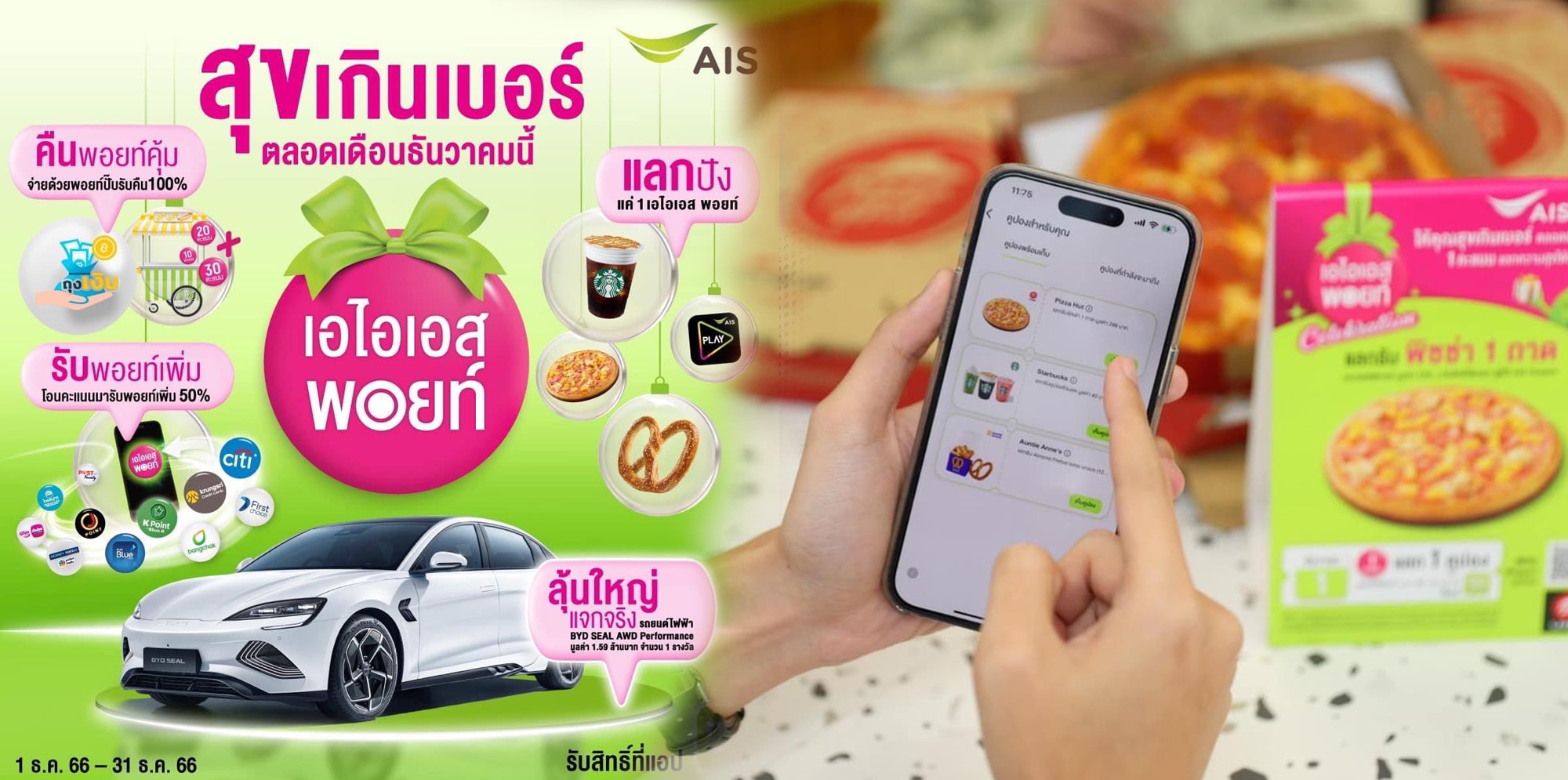 • แลกได้ตามใจ ใช้เพียง 1 คะแนน แลกคูปองส่วนลด/รับฟรี จากแบรนด์ชั้นนำ ไม่ซ้ำกัน จันทร์-ศุกร์ ตลอดเดือนธันวาคม ไม่ว่าจะเป็น อาหาร ของหวานและเครื่องดื่ม, ส่วนลดและ voucher, สติกเกอร์ LINE, เน็ตฟรี, ส่วนลดการเติมน้ำมัน, ส่วนลด Food Delivery, ฟรี วอลเปเปอร์เสริมดวง และอื่นๆ อีกมากมาย ที่แอป myAIS ตั้งแต่วันที่ 1 – 31 ธันวาคม 2566