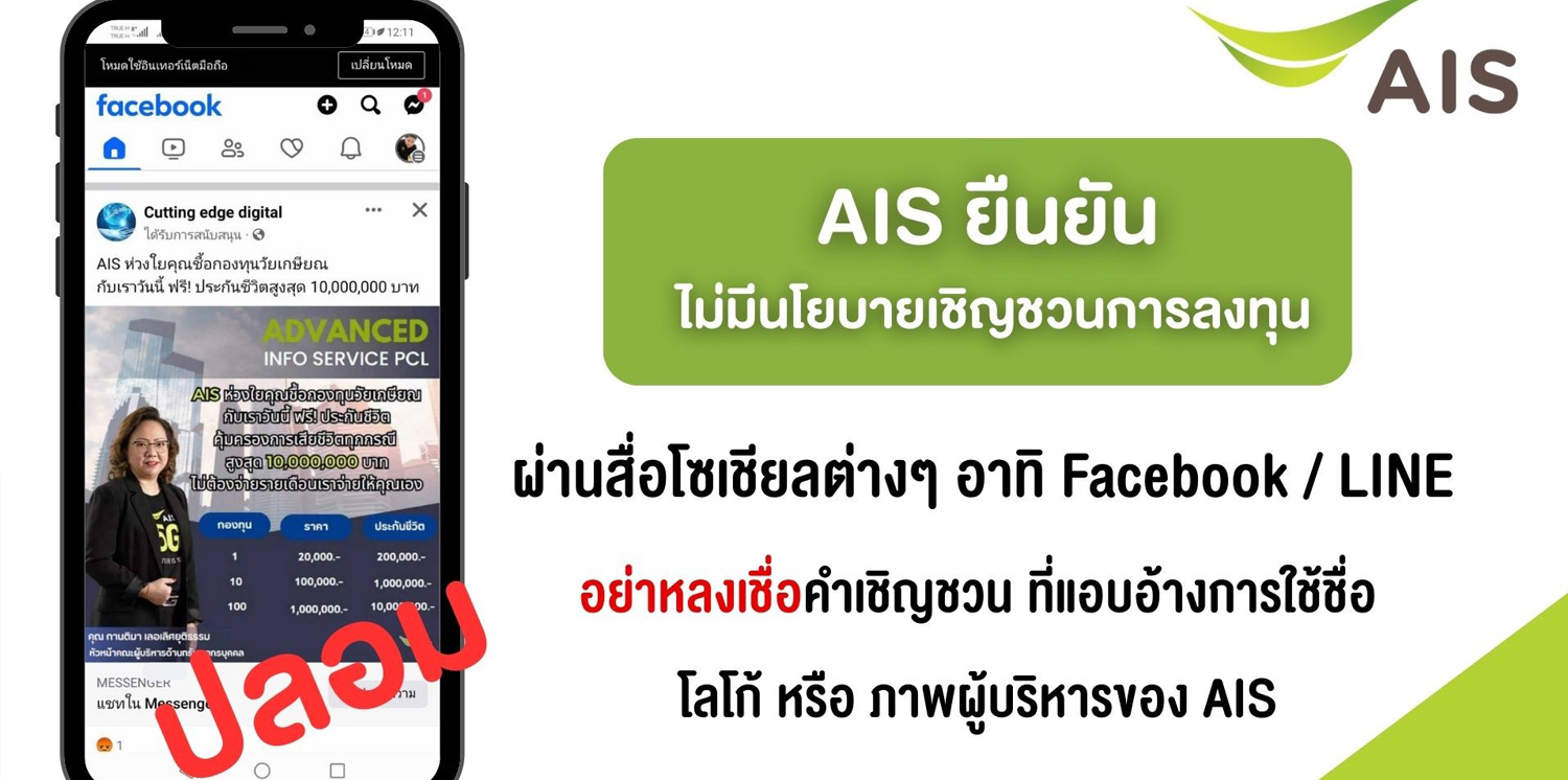 จากกรณีที่มีการแชร์ภาพในช่องทางโซเชียลมีเดีย แอบอ้างการนำโลโก้และภาพผู้บริหารของ AIS ไปชักชวนการลงทุน จนสร้างความเข้าใจผิดต่อลูกค้าและผู้พบเห็นนั้น AIS ขอยืนยันว่า ข้อความการแอบอ้างดังกล่าวไม่เป็นความจริง โดย บริษัทฯ ไม่มีนโยบายและไม่มีการโฆษณา เชิญชวนการลงทุนผ่านช่องทางออนไลน์ หรือ สื่อโซเชียลต่างๆ อาทิ Facebook, LINE, ฯลฯ ซึ่งบริษัทฯได้ดำเนินการตรวจสอบร่วมกับผู้ให้บริการแพลตฟอร์มอย่างใกล้ชิดในการปิดการเข้าถึง เพื่อป้องกันความเสียหายที่อาจเกิดขึ้นกับประชาชนมาแล้วอย่างต่อเนื่อง