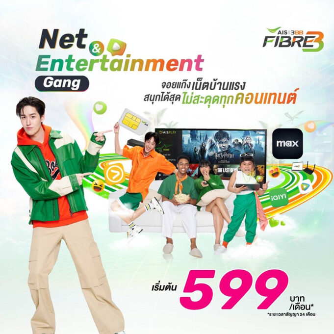 AIS 3BB FIBRE3 เปิดตัวแพ็กใหม่ล่าสุด Net & Entertainment Gang ราคาเริ่มต้นเพียง 599 บาทต่อเดือน มอบความเร็วอินเทอร์เน็ตแรงเต็มสปีด พร้อมความบันเทิงคุณภาพบน Max แพลตฟอร์มสตรีมมิ่งระดับโลกจาก Warner Bros. Discovery ลูกค้าสามารถรับชมซีรีส์ดังและคอนเทนต์ระดับพรีเมียมจาก Max Standard Plan อาทิ The White Lotus, The Last of Us, House of the Dragon, Friends และอีกมากมาย และยังสามารถรับชม 5 ช่องจาก HBO (HBO, HBO Hits, HBO Family, HBO Signature, Cinemax) รวมถึงคอนเทนต์เกาหลีและเอเชียยอดนิยมจาก Viu, iQIYI และ WeTV ผ่านกล่อง AIS PLAXBOX ครบจบทั้งเน็ตและบันเทิงในแพ็กเดียว