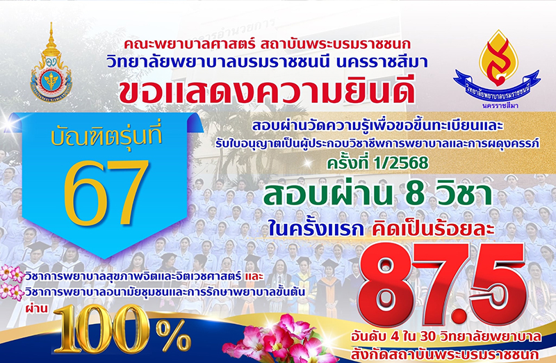 และอีกหนึ่งความภาคภูมิใจในปีนี้ คือผลสัมฤทธิ์ทางวิชาการที่โดดเด่นของบัณฑิตในปีล่าสุด ซึ่งสามารถสอบผ่านวัดความรู้เพื่อขอขึ้นทะเบียนและรับใบอนุญาตเป็นผู้ประกอบวิชาชีพการพยาบาลและการผดุงครรภ์ (ครั้งที่ 1/2568) ในอัตราร้อยละ 87.50 เพิ่มขึ้นจากปีก่อนที่อยู่ร้อยละ 81.25 และยังติดอันดับ 1 ใน 5 ของวิทยาลัยพยาบาลทั้งหมด 30 แห่งในสังกัดสถาบันพระบรมราชชนกทั่วประเทศ