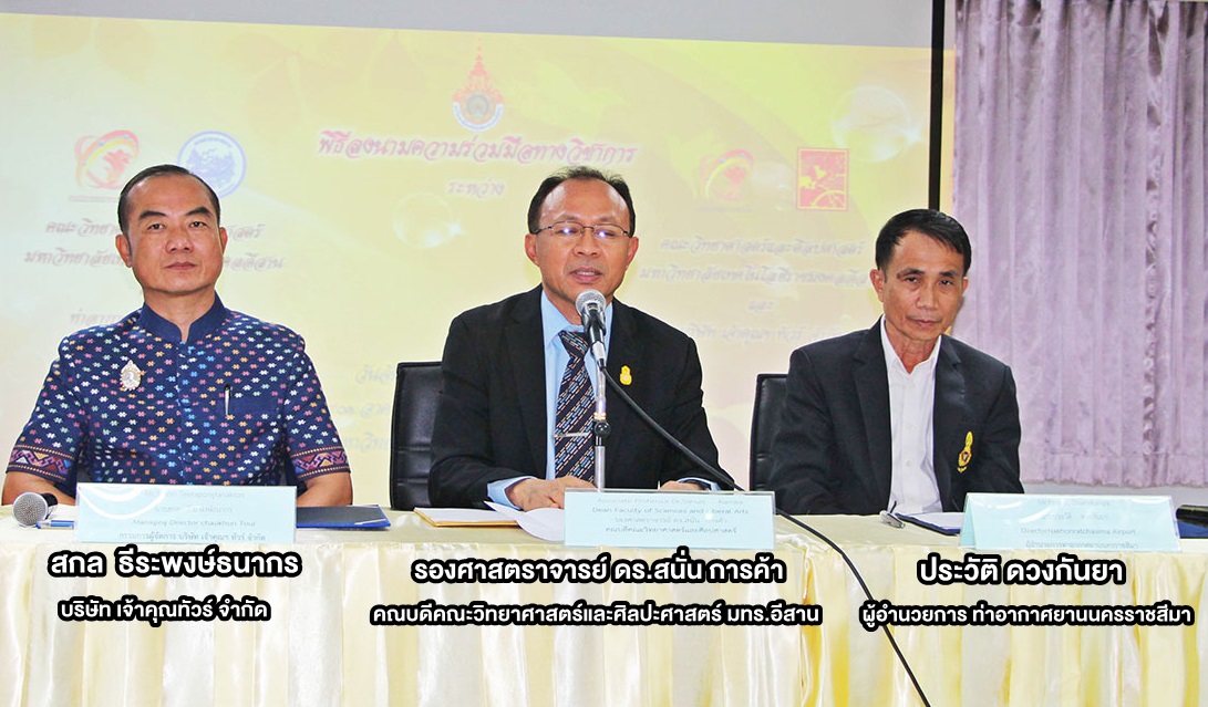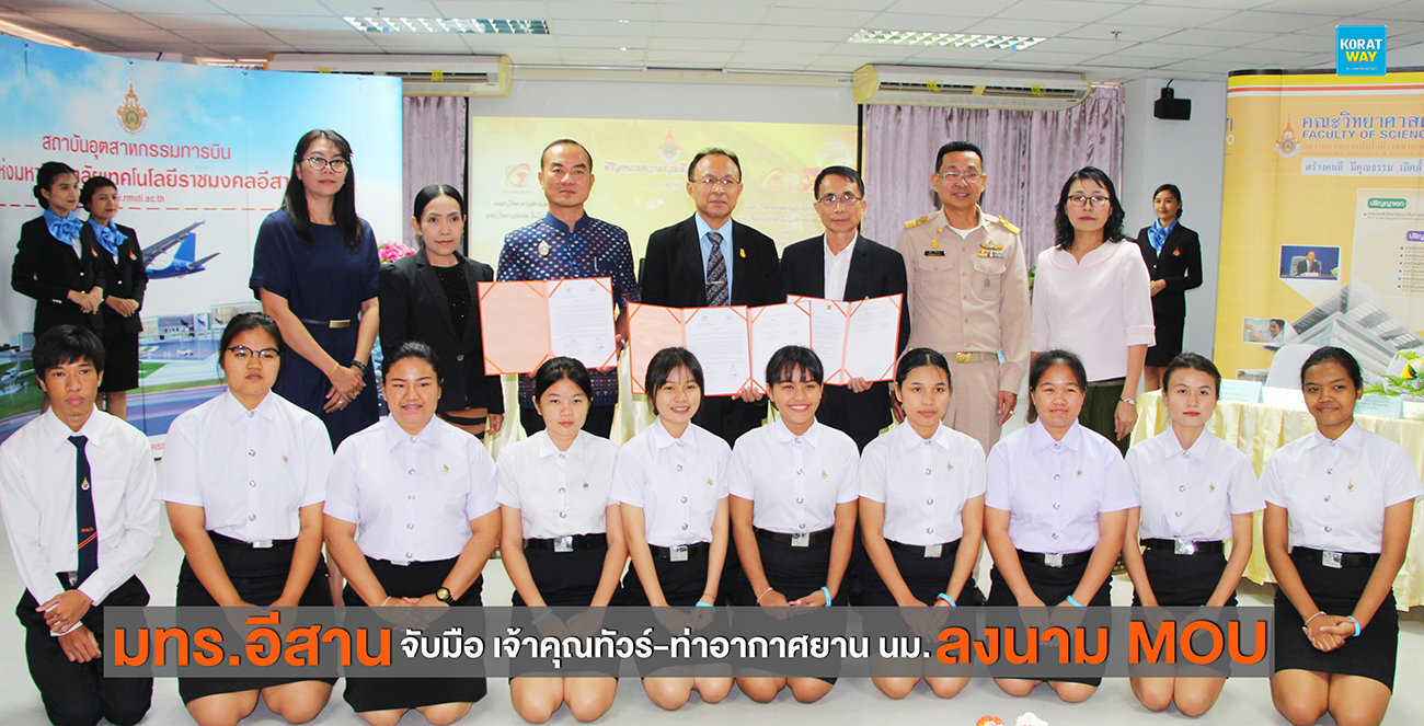 เมื่อวันที่ 4 ก.พ.62 มทร.อีสาน โดย รองศาสตราจารย์ ดร.สนั่น การค้า คณบดีคณะวิทยาศาสตร์และศิลปะศาสตร์, บ.เจ้าคุณทัวร์ โดย นายสกล ธีระพงษ์ธนากร กรรมการผู้จัดการ และ ท่าอากาศยานนครราชสีมา โดย นายประวัติ ดวงกันยา ผู้อำนวยการฯ ร่วมลงนามบันทึกข้อตกลงความร่วมมือทางวิชาการ MOU โดยมี คณะอาจารย์ นิสิตนักศึกษา และสื่อมวลชนร่วมเป็นสักขีพยาน ณ อาคารคณะวิทยาศาสตร์และศิลปะศาสตร์ มหาวิทยาลัยเทคโนโลยีราชมงคลอีสาน นครราชสีมา
