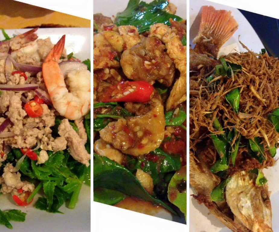 ส่วนปลาก็จะเป็นปลาทับทิม หรือปลาช่อน นำมาบั่งแล้วทอดจนกรอบ สีเหลืองทองทั่วทั้งตัวครับ มีน้ำจิ้มสูตรเฉพาะมาให้จิ้มรับประทานด้วยครับ หรือจะเป็นไก่บ้าน ปีกไก่ทอดสมุนไพร ก็แสนจะอร่อย ปลาทับทิมทอดน้ำปลาก็อร่อยไม่แพ้กันครับ