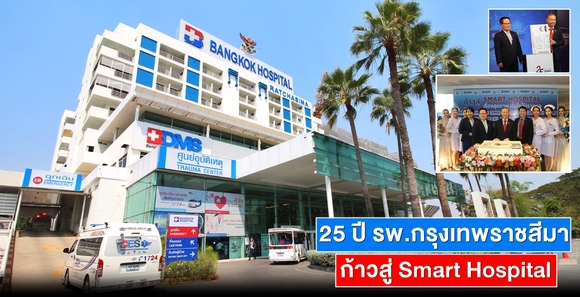 ตัดเค้กฉลองครบรอบ 25 ปี โรงพยาบาลกรุงเทพราชสีมา โรงพยาบาลเอกชนที่ดีที่สุดในภาคอีสาน ด้วยศักยภาพด้านการแพทย์และงานบริการที่เป็นเลิศ รวดเร็ว ทันใจ ครบวงจร พร้อมก้าวสู่ Smart Hospital นำร่องให้บริการผ่านสมาร์ทโฟน 4 โปรแกรม 1.Pre Register ลงทะเบียนพบแพทย์ออนไลน์, 2.ตู้ Kiosk ให้ลงทะเบียนเองเมื่อมาใช้บริการ 3.Smart IPD ให้ผู้ป่วยรู้ข้อมูลของตนเองขณะรักษา และ 4.Smart Check Up Online ดูผลการตรวจสุขภาพออนไลน์