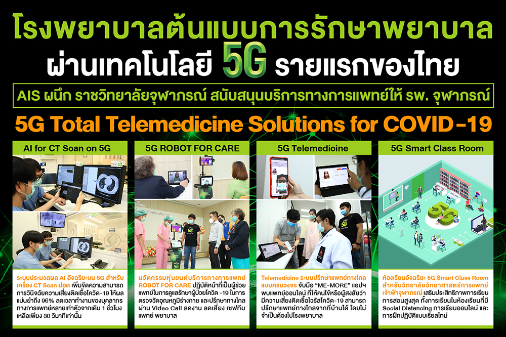 เดินหน้าภารกิจเร่งด่วน AIS 5G สู้ภัยโควิด-19 ต่อเนื่อง นำเครือข่าย 5G อัจฉริยะ เสริมศักยภาพวงการแพทย์และสาธารณสุข ตั้งแต่ต้นน้ำถึงปลายน้ำ โดยผนึก ราชวิทยาลัยจุฬาภรณ์ ร่วมพัฒนา 5G Total Telemedicine Solutions เต็มรูปแบบ เพื่อสนับสนุนบริการทางการแพทย์ให้โรงพยาบาลจุฬาภรณ์ ยกเป็น โรงพยาบาลต้นแบบแห่งการรักษาพยาบาลผ่านเทคโนโลยี 5G รายแรกของไทย โดยผสมผสาน 5G ในทุกมิติของการให้บริการทางการแพทย์ ด้วยนวัตกรรม 5G Robotics หุ่นยนต์ช่วยดูแลผู้ป่วย, ระบบประมวลผล AI อัจฉริยะบน 5G เพิ่มขีดความสามารถเครื่องมือและอุปกรณ์ทางการแพทย์