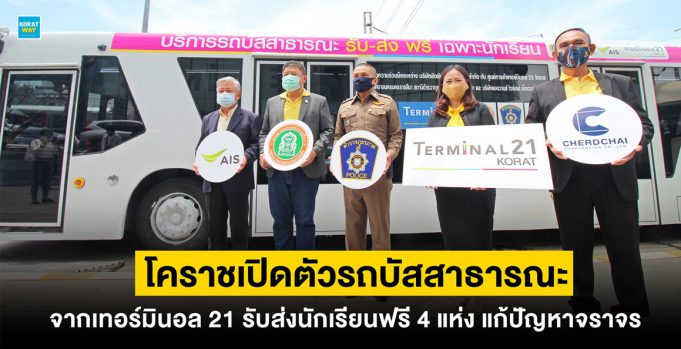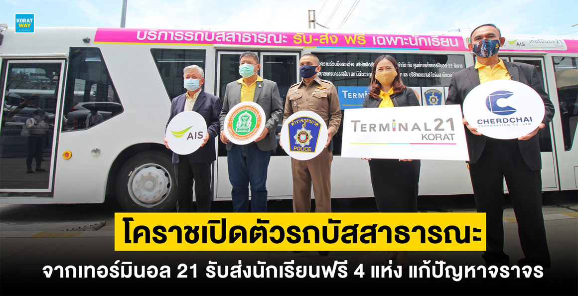 5 องค์กรโคราชนำโดย บริษัท เชิดชัย คอร์ปอเรชั่น จำกัด, ศูนย์การค้าเทอร์มินอล 21 โคราช, เทศบาลนครนครราชสีมา, สถานีตำรวจภูธรจังหวัดนครราชสีมา และเอไอเอส ผนึกกำลังร่วมลงนามบันทึกข้อตกลงความร่วมมือ MOU เปิดบริการรถบัสสาธารณะ รับ-ส่งนักเรียนฟรี! 4 โรงเรียน ไม่คิดค่าใช้จ่าย เพื่อแก้ไขปัญหาจราจรที่แออัดในตัวเมือง เริ่มใช้ต้นเดือนสิงหาคมนี้