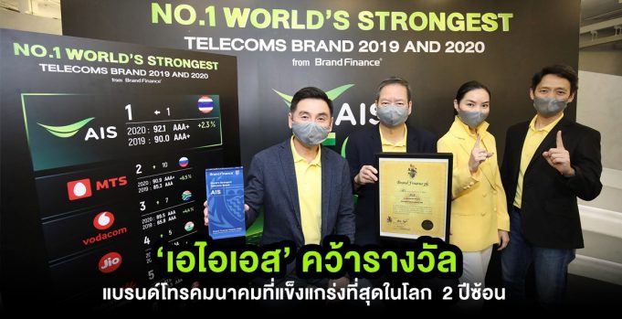 เอไอเอส ได้รับการจัดอันดับเป็น NO.1 แบรนด์โทรคมนาคมที่แข็งแกร่งที่สุดในโลก – World’s Strongest Telecoms Brand ต่อเนื่องเป็นปีที่ 2 จากผลสำรวจและจัดอันดับแบรนด์ที่แข็งแกร่งที่สุด ประจำปี 2020 โดย Brand Finance ตอกย้ำการเป็นผู้นำด้านโทรคมนาคมที่มีประสิทธิภาพที่แท้จริง ถือเป็นแบรนด์เดียวในไทย ที่ติดอันดับ 1 ใน 10 และเป็นแบรนด์โทรคมนาคมเพียงรายเดียวที่ยังสามารถรักษามาตรฐานระดับ AAA+ และได้คะแนน Brand Strength Index (BSI) สูงขึ้นจากปีก่อน