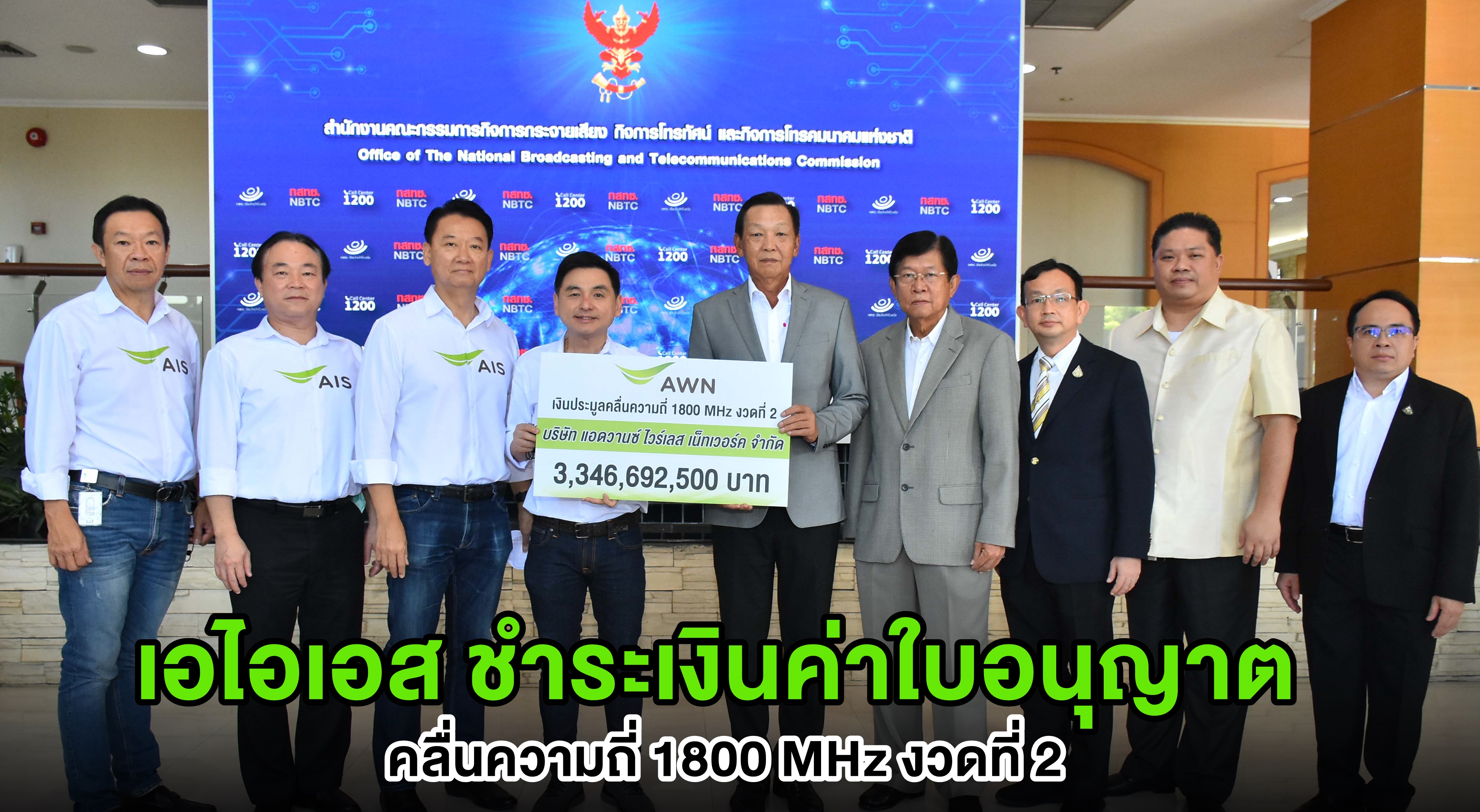 นายสมชัย เลิศสุทธิวงค์ ประธานเจ้าหน้าที่บริหาร บริษัท แอดวานซ์  อินโฟร์ เซอร์วิส จำกัด (มหาชนหรือ เอไอเอส ในฐานะผู้บริหาร บริษัท แอดวานซ์ ไวร์เลส เน็ทเวอร์ค จำกัด (เอดับบลิวเอ็นผู้ชนะการประมูลคลื่นความถี่ 1800 MHz ย่าน (1740 – 1745 1835 1840 MHz ในมูลค่ารวม 12,511 ล้านบาท ได้นำเงินไปชำระค่าประมูลคลื่นความถี่ย่าน 1800 MHz งวดที่ 2 เป็นเงินจำนวน 3,346,692,500.00 บาท (สามพันสามร้อยสี่สิบหกล้านหกแสนเก้าหมื่นสองพันห้าร้อยบาทถ้วน) รวมภาษีมูลค่าเพิ่มแล้ว โดยมี พลเอกสุกิจ ขมะสุนทร ประธานกรรมการกิจการกระจายเสียง กิจการโทรทัศน์ และกิจการโทรคมนาคมแห่งชาติ (กสทช.) เป็นผู้รับมอบ เพื่อนำส่งเงินเป็นรายได้ของแผ่นดินต่อไป