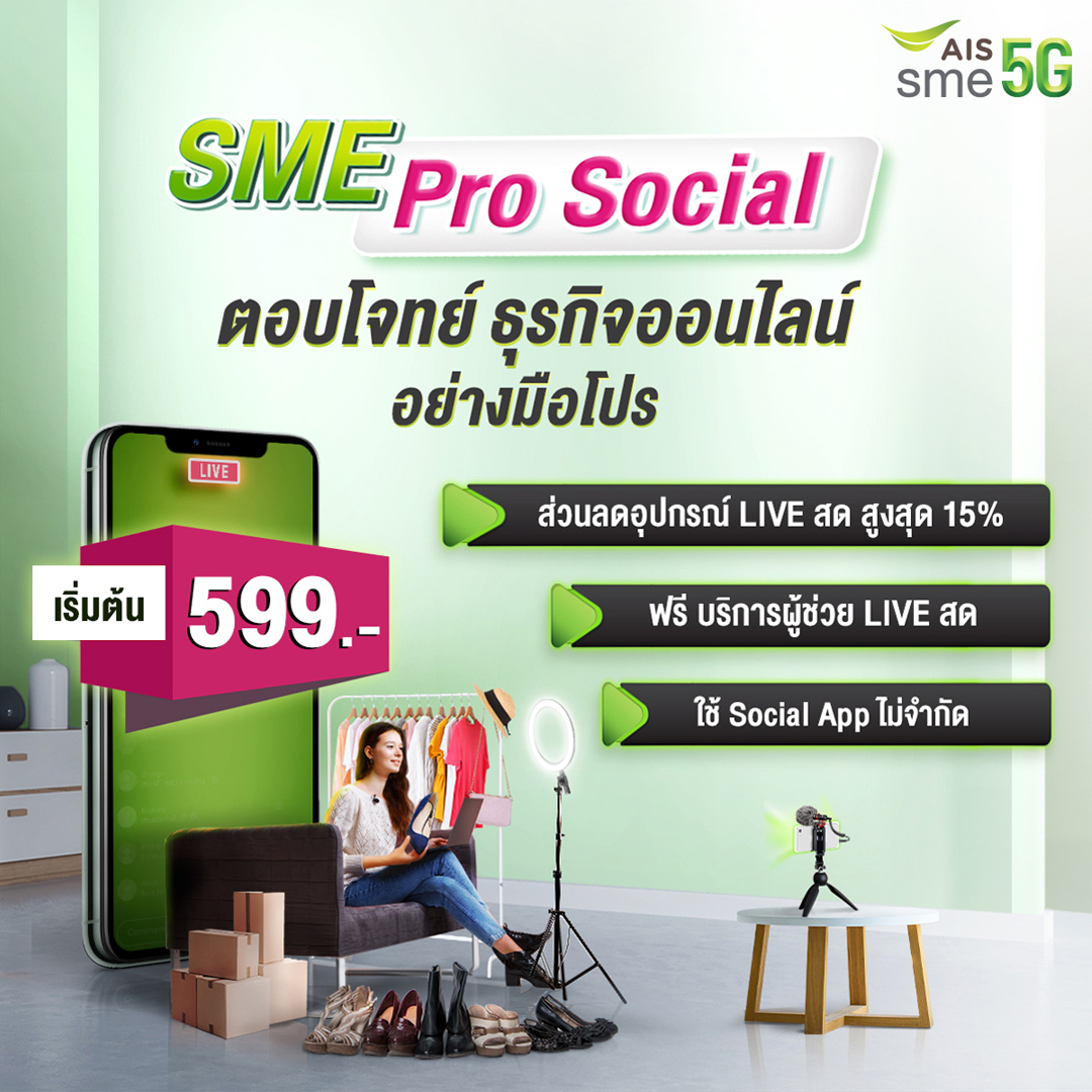 1. AIS SME Mobile Services : ครบเครื่องทุกรูปแบบการสื่อสารที่ออกแบบมาแล้วว่าเหมาะกับธุรกิจออนไลน์ อาทิ SME Pro Social ให้เป็นนักธุรกิจออนไลน์แบบมือโปร เริ่มต้นเพียง