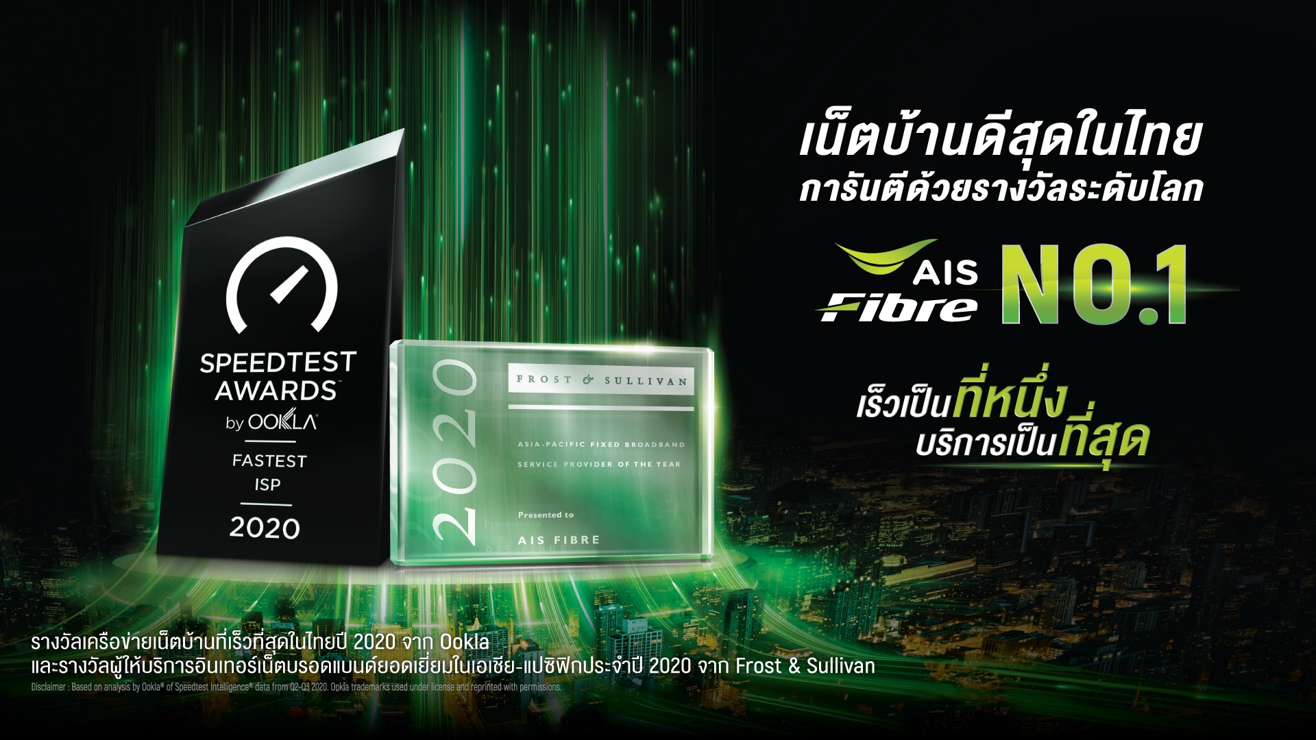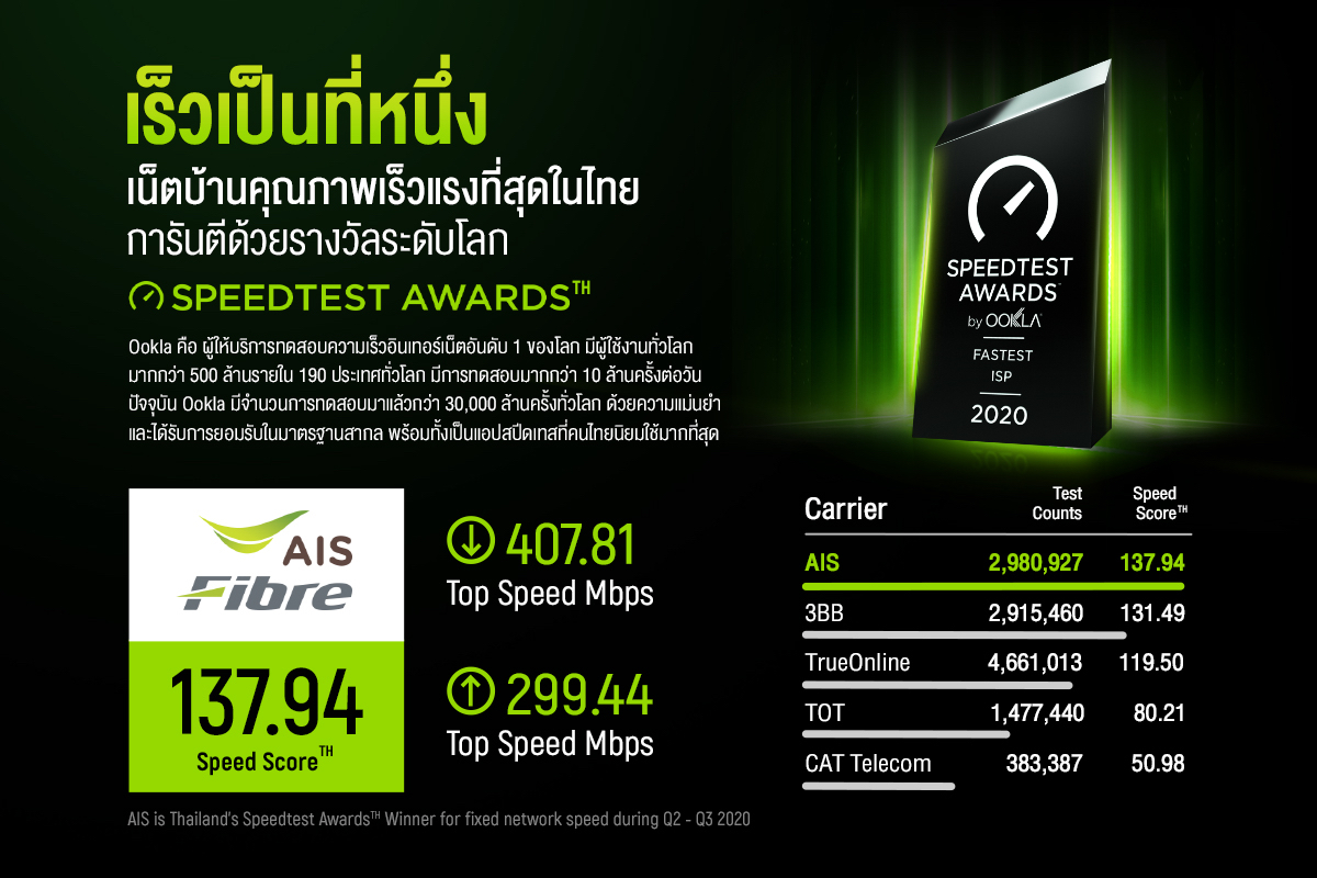โดยผลล่าสุด ในปี 2020 AIS Fibre ยังคงเป็นอันดับหนึ่ง ด้วยคะแนนความเร็วในการให้บริการอินเทอร์เน็ต Speed Score 137.94 ความเร็วเฉลี่ยการดาวน์โหลด 407.81 Mbps ความเร็วเฉลี่ยการอัปโหลด 299.44 Mbps สอดคล้องกับรายงานก่อนหน้านี้ที่ Ookla ได้เผยผลการทดสอบความเร็วการดาวน์โหลดของอินเทอร์เน็ตทั่วโลกในปี 2020 ว่า อินเทอร์เน็ตบ้านของไทย มีความเร็วเฉลี่ยในการดาวน์โหลดสูงเป็นอันดับ 1 ของโลก โค่นแชมป์เก่าอย่างสิงคโปร์และฮ่องกงขาดลอย ซึ่งแน่นอนว่า ผลจากความทุ่มเทของชาว AIS Fibre ทุกคนเป็นส่วนหนึ่งที่ทำให้ประเทศไทยได้รับการยอมรับถึงการยกระดับคุณภาพการพัฒนาโครงสร้างพื้นฐานด้านดิจิทัล อันเป็นดัชนีชี้วัดสำคัญสู่ความเชื่อมั่นในระดับสากลจากรายงานดังกล่าว”