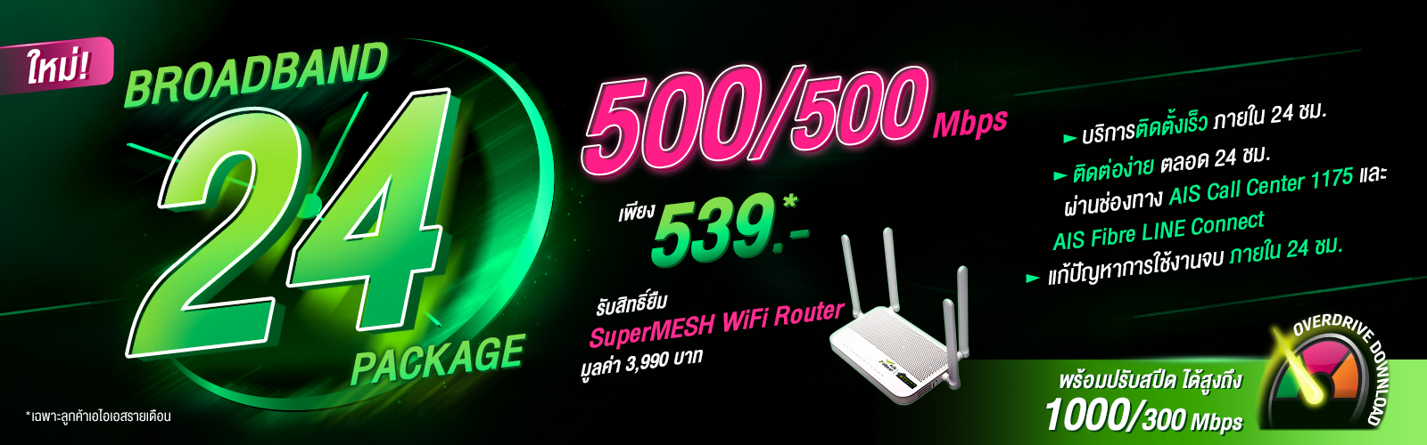 – มอบความเร็วสูงถึง 500/500 Mbps ในราคาเพียง 599 บาท/เดือน นาน 24 เดือน (ลูกค้า AIS ลด 10% เพียง 539 บาท/เดือน) พร้อมเป็นรายเดียวที่มีฟีเจอร์ Speed Toggle ให้ปรับสปีดความเร็วได้สูงสุดถึง 1 Gbps โดยสามารถปรับ Overdrive Download ที่ 1000/300 Mbps หรือ Overdrive Upload ที่ 300/1000 Mbps ได้ฟรี ไม่จำกัดจำนวนครั้ง ผ่าน myaisfibre.com หรือ AIS Fibre LINE Connect