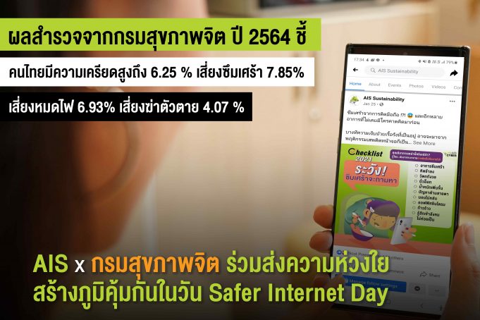 เอไอเอส ส่งความห่วงใยให้คนไทยยุคโควิด-19 ที่ใช้ชีวิตบนโลกออนไลน์ หลังผลสำรวจของกรมสุขภาพจิตในเดือนมกราคม ปี 2564 พบว่าประชาชนทั่วไปมีความเครียดสูง 6.25% มีภาวะเสี่ยงซึมเศร้า 7.85% มีภาวะเสี่ยงฆ่าตัวตาย 4.07% และมีภาวะเสี่ยงหมดไฟ 6.93% ดังนั้นจึงต่อยอดโครงการ “อุ่นใจไซเบอร์” มุ่งสร้างความตระหนักรู้ในเรื่อง Cyber Wellness เพื่อให้คนไทยใช้ชีวิตบนโลกออนไลน์อย่างถูกวิธี ล่าสุดถือฤกษ์วัน Safer Internet Day ผนึกกำลังกรมสุขภาพจิต ร่วมลงนามความร่วมมือ จัดทำแพลตฟอร์มหลักสูตรการเรียนรู้ดิจิทัล เพื่อเสริมสร้างทักษะการใช้ชีวิตบนโลกออนไลน์ และสร้างภูมิคุ้มกันให้กับคนไทยใช้ชีวิตบนโลกออนไลน์อย่างสร้างสรรค์ และยั่งยืน