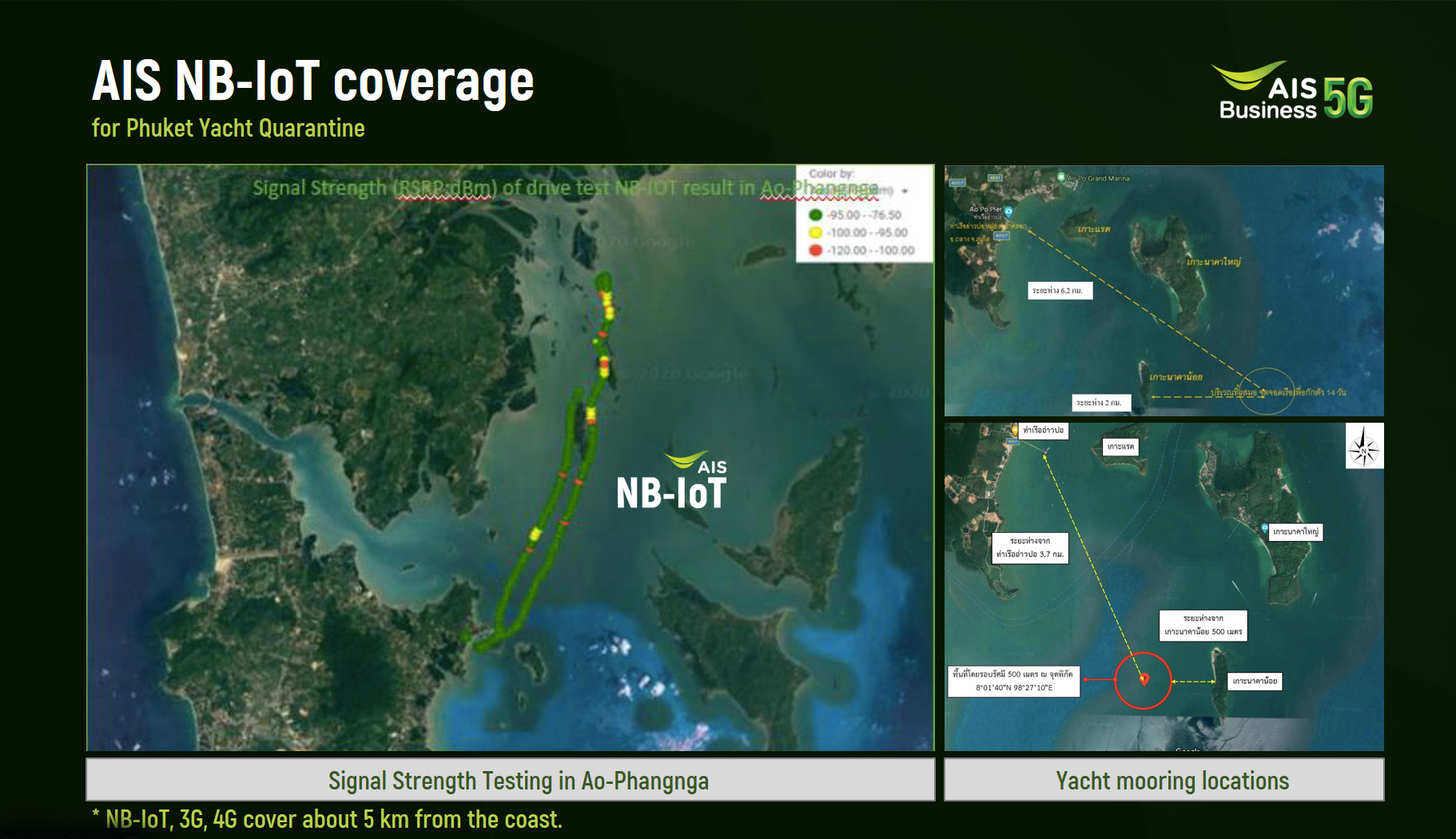 นายธนพงษ์ อิทธิสกุลชัย หัวหน้าคณะผู้บริหารกลุ่มลูกค้าองค์กร เอไอเอส กล่าวว่า “ในฐานะ Digital Life Service Provider ซึ่งมีโครงสร้างพื้นฐานด้านดิจิทัลที่แข็งแกร่งเป็นอันดับ 1 ด้วยเครือข่าย AIS 4G, 5G ที่มีคลื่นมากที่สุด ครบทั้งย่านความถี่ต่ำ,กลาง และสูง ครอบคลุมการใช้งานทุกรูปแบบ (คลื่น 700 MHz, คลื่น 2600 MHz และคลื่น 26 GHz) ตลอดจนเครือข่าย IoT ทั้ง NB–IoT และ eMTC ที่ครอบคลุมทั้ง 77 จังหวัด เรามีความมุ่งมั่นในการนำเทคโนโลยีดิจิทัลและขีดความสามารถของทีมงาน มายกระดับโครงสร้างพื้นฐานของประเทศอย่างต่อเนื่อง โดยเฉพาะอย่างยิ่งในช่วงการแพร่ระบาดของโควิด-19 ในช่วงที่ผ่านมากับ “โครงการ AIS5G สู้ภัยโควิด” ที่ได้นำศักยภาพของโครงข่ายไปใช้ในพื้นที่กักตัวและโรงพยาบาลสนามหลักหลายแห่ง อาทิ โรงพยาบาลธรรมศาสตร์เฉลิมพระเกียรติ ,ศูนย์ห่วงใยคนสาคร, ฯลฯ ซึ่งล่าสุดกับ “โครงการกักตัววิถีใหม่บนเรือยอชต์-Digital Yacht Quarantine ครั้งแรกในไทย ด้วยศักยภาพโครงข่าย AIS NB– IoT และนวัตกรรมสายรัดข้อมือติดตามสุขภาพอัจฉริยะ” (NB–IoT Wristband Tourist Tracking)” ที่เป็นรูปแบบการกักตัวนักท่องเที่ยวบนเรือยอชต์กลางทะเลก่อนเดินทางขึ้นบก เราจึงเลือกใช้เครือข่าย Narrow Band IoT ที่รองรับการเชื่อมต่อกับอุปกรณ์ IoT บนคลื่น 900 MHz ที่สามารถกระจายสัญญาณออกไปในทะเลได้มากกว่า 10 กม. พร้อมด้วยแพลตฟอร์ม Cloud มาเป็นเครือข่ายหลักเชื่อมต่อกับแพลตฟอร์มนวัตกรรมสายรัดข้อมือติดตามสุขภาพอัจฉริยะ (NB–IoT Wristband Tracking) ที่พัฒนาขึ้นโดยบริษัท พีเอ็มเอช โฮลดิ้ง หรือ POMO ผู้ให้บริการโซลูชั่น Tracking และ Monitoring ที่จะมอนิเตอร์ข้อมูลสุขภาพ (Health Monitoring) ของนักท่องเที่ยว ทั้งอุณหภูมิร่างกาย, อัตราการเต้นของหัวใจ, สัญญาณชีพจร รวมถึงพิกัดของนักท่องเที่ยว และส่งข้อมูลต่อมายังแพทย์และเจ้าหน้าที่ผู้เกี่ยวข้อง ให้สามารถวิเคราะห์ข้อมูลความเสี่ยงด้านสุขภาพของนักท่องเที่ยวได้แบบเรียลไทม์ ในระหว่างกักตัว 14 วันบนเรือก่อนเดินทางขึ้นบกเพื่อท่องเที่ยวต่อไป