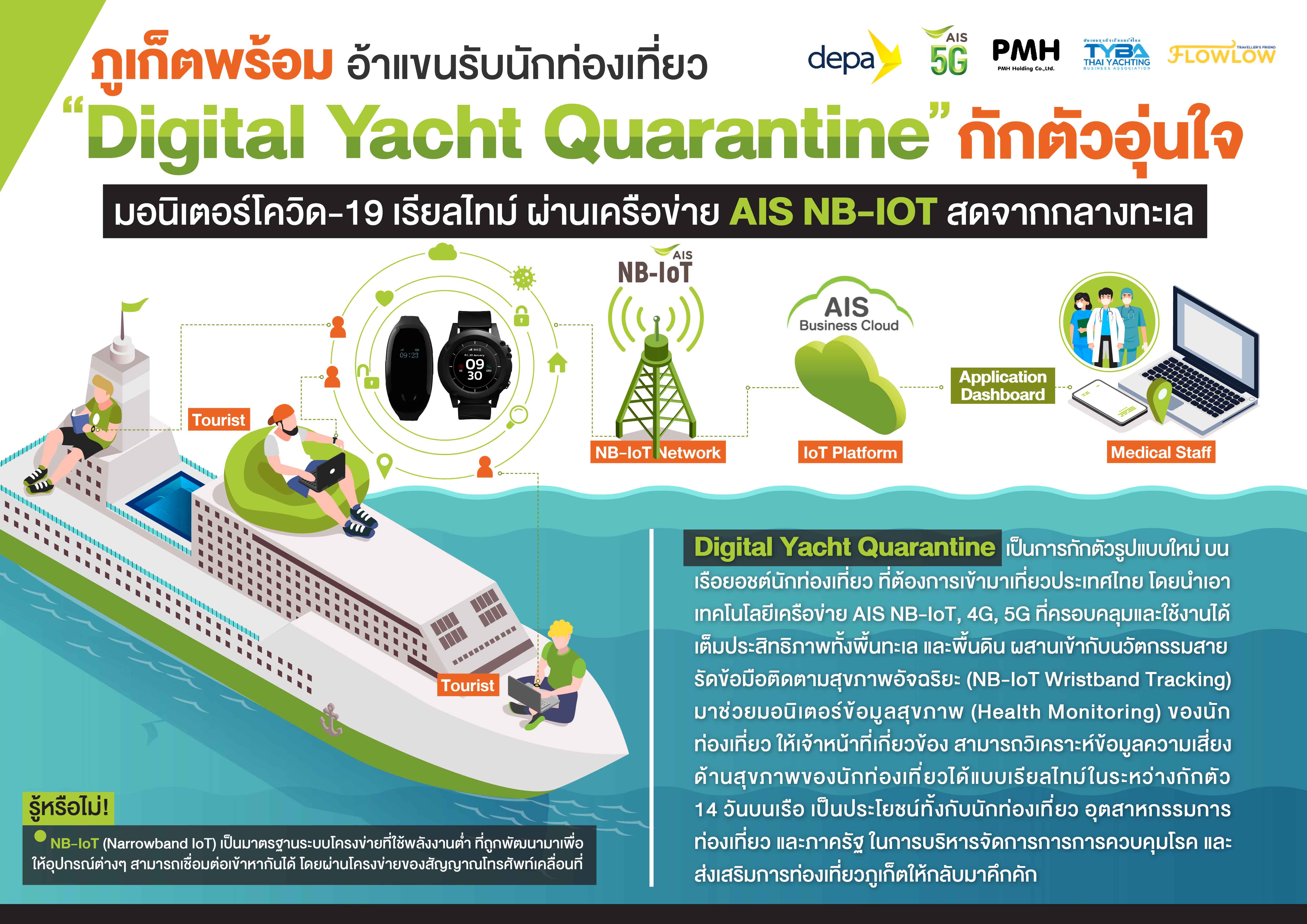 ล่าสุด ดีป้า พร้อมด้วยพันธมิตร อย่าง บริษัท แอดวานซ์ อินโฟร์ เซอร์วิส จำกัด (มหาชน) หรือ เอไอเอส , บริษัทพีเอ็มเอชโฮลดิ้ง จำกัด (POMO) กลุ่มผู้ประกอบการบริหารจัดการท่าเรือ และสมาคมธุรกิจเรือยอชต์ไทย เล็งเห็นปัญหาในจุดนี้ จึงได้ร่วมมือจัดทำ “โครงการกักตัววิถีใหม่บนเรือยอชต์ –Digital Yacht Quarantine ครั้งแรกในไทย ด้วยแพลตฟอร์มนวัตกรรมสายรัดข้อมือติดตามสุขภาพอัจฉริยะ ผ่านเทคโนโลยี NB–IoT (NB–IoT Wristband Tourist Tracking) เครื่องมือมอนิเตอร์ข้อมูลสุขภาพ (Health Monitoring) ของนักท่องเที่ยวระหว่างกักตัว 14 วัน ซึ่งจะช่วยสร้างความมั่นใจและเสริมความปลอดภัยด้านสาธารณสุขแก่นักท่องเที่ยวที่เดินทางมายังจังหวัดภูเก็ต ทำให้การกักตัวบนเรือยอชต์ของนักท่องเที่ยวและการทำงานของทีมแพทย์ ตลอดจนเจ้าหน้าที่ผู้เกี่ยวข้อง ในการควบคุมการแพร่ระบาดของโควิด-19 ให้ดำเนินไปอย่างมีประสิทธิภาพ