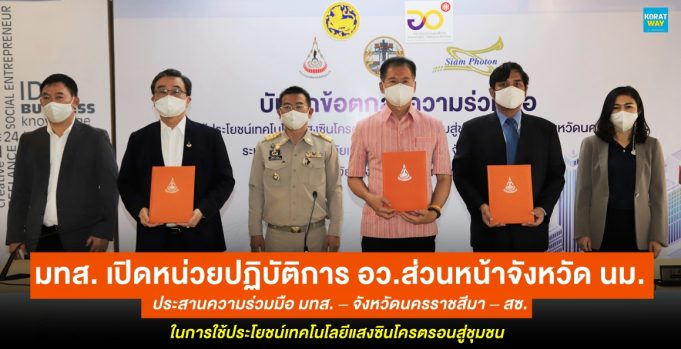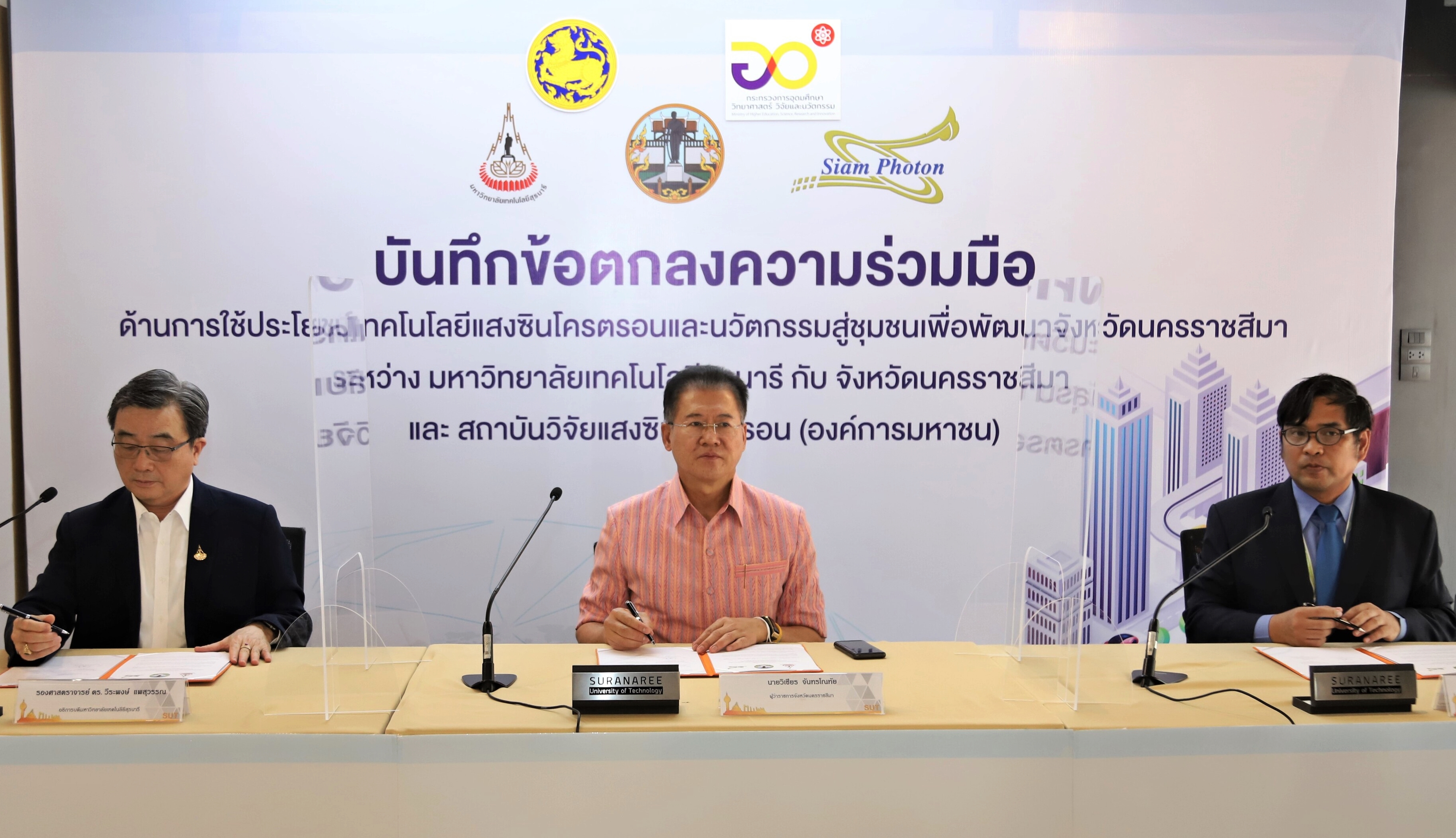 มหาวิทยาลัยเทคโนโลยีสุรนารี (มทส.) จัดพิธีเปิดหน่วยปฏิบัติการ อว.ส่วนหน้าจังหวัดนครราชสีมา ทำพิธีลงนามความร่วมมือด้านการใช้ประโยชน์เทคโนโลยีแสงซินโครตรอนและนวัตกรรมสู่ชุมชนเพื่อพัฒนาจังหวัดนครราชสีมา โดยมี นายวิเชียร จันทรโณทัย ผู้ว่าราชการจังหวัดนครราชสีมา, รองศาสตราจารย์ ดร.วีระพงษ์ แพสุวรรณ อธิการบดีมหาวิทยาลัยเทคโนโลยีสุรนารี, และ รองศาสตราจารย์ ดร.สาโรช รุจิรวรรธน์ ผู้อำนวยการสถาบันวิจัยแสงซินโครตรอน (องค์การมหาชน) ร่วมลงนามบันทึกข้อตกลงความร่วมมือระหว่างสามหน่วยงาน ณ SUT Co-Working Space เทคโนธานี มหาวิทยาลัยเทคโนโลยีสุรนารี (16 มี.ค. 64)