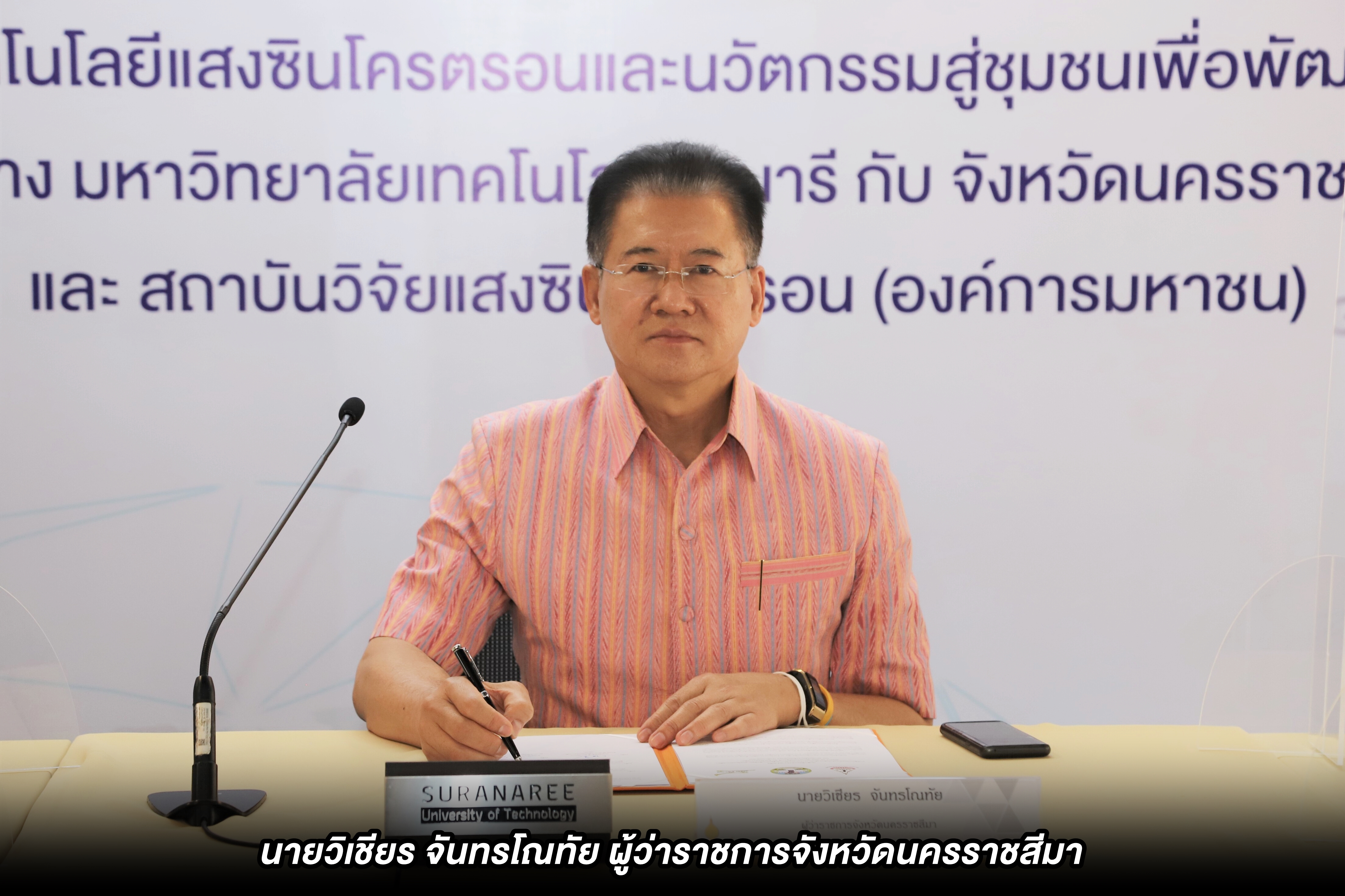นายวิเชียร จันทรโณทัย ผู้ว่าราชการจังหวัดนครราชสีมา กล่าวว่า “ความร่วมมือในวันนี้นับเป็นจุดเริ่มต้นระหว่างจังหวัดนครราชสีมา มหาวิทยาลัยเทคโนโลยีสุรนารี และสถาบันวิจัยแสงซินโครตรอน (องค์การมหาชน) ที่จะส่งเสริมความร่วมมือทางวิชาการด้านการใช้ประโยชน์จากแสงซินโครตรอนและนวัตกรรม ที่เป็นประโยชน์ต่อการพัฒนาจังหวัดนครราชสีมา เพื่อพัฒนาองค์ความรู้และถ่ายทอดเทคโนโลยีให้แก่เจ้าหน้าที่ในหน่วยงานภาครัฐ ภาคเอกชน ชุมชน กลุ่มอาชีพ กลุ่มวิสาหกิจชุมชม ผู้ประกอบการชุมชนท้องถิ่น และประชาชนทั่วไป ได้เข้าใจและเข้าถึงเทคโนโลยีและนวัตกรรมสมัยใหม่โดยสะดวกและทั่วถึง