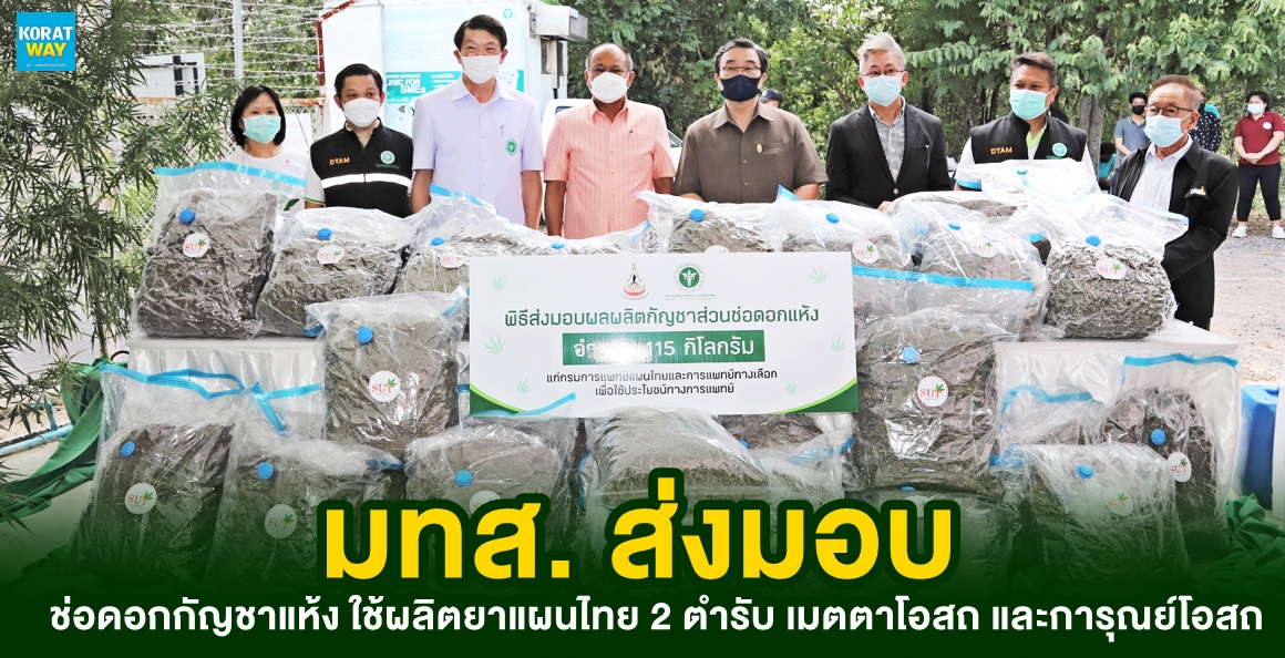 (22 มิ.ย.64) ณ สวนเกษตรเฉลิมพระเกียรติ 50 พรรษา นายกอบชัย บุญอรณะ ผู้ว่าราชการจังหวัดนครราชสีมา เป็นประธานในพิธีส่งมอบผลผลิตกัญชาส่วนช่อดอกแห้ง จำนวน 115 กิโลกรัม จากโครงการผลิตกัญชาเชิงคุณภาพเพื่อใช้ประโยชน์ทางการแพทย์ สำนักวิชาเทคโนโลยีการเกษตร มหาวิทยาลัยเทคโนโลยีสุรนารี (มทส.) ให้แก่ กรมการแพทย์แผนไทยและการแพทย์ทางเลือก กระทรวงสาธารณสุข โดยมี รองศาสตราจารย์ ดร.วีระพงษ์ แพสุวรรณ อธิการบดีมหาวิทยาลัยเทคโนโลยีสุรนารี (มทส.) เป็นผู้ส่งมอบแก่ นายแพทย์ ขวัญชัย วิศิษฐานนท์ รองอธิบดีกรมการแพทย์แผนไทยและการแพทย์ทางเลือก พร้อมด้วย ศาสตราจารย์ ดร.หนึ่ง เตียอำรุง คณบดีสำนักวิชาเทคโนโลยีการเกษตร มทส. และหัวหน้าหน่วยงานภาครัฐและเอกชนในจังหวัดนครราชสีมา เข้าร่วมเป็นเกียรติในพิธี