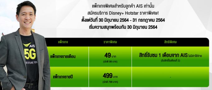 นายปรัธนา ลีลพนัง หัวหน้าคณะผู้บริหาร กลุ่มลูกค้าทั่วไป AIS อธิบายว่า “ด้วยกระแสความนิยมของคนไทยที่มีต่อการมาของ Disney+ Hotstar รวมถึงผลตอบรับอย่างล้นหลามในการเปิดตัวเป็นผู้ให้บริการอย่างเป็นทางการ เราจึงขอมอบประสบการณ์ช่วงเวลาแห่งความสุข เปิดโลกจินตนาการ สู่การรับชมคอนเทนต์ภายใน Disney+ Hotstar บนเครือข่าย 5G ที่ดีที่สุดให้กับคนไทยและลูกค้า AIS ต่อเนื่อง ด้วยแพ็กเกจพิเศษของ AIS 5G เพียงเดือนละ 49 บาท นาน 12 รอบบิล (จากราคาปกติเดือนละ 99 บาท) พร้อมรับสิทธิ์ชมเพิ่มอีก 1 เดือน จาก AIS สมัครได้ที่โทร *111 และแพ็กเกจรายปี 499 บาท (จากราคาปกติปีละ 799 บาท) ในวันพุธที่ 30 มิถุนายน เป็นต้นไป