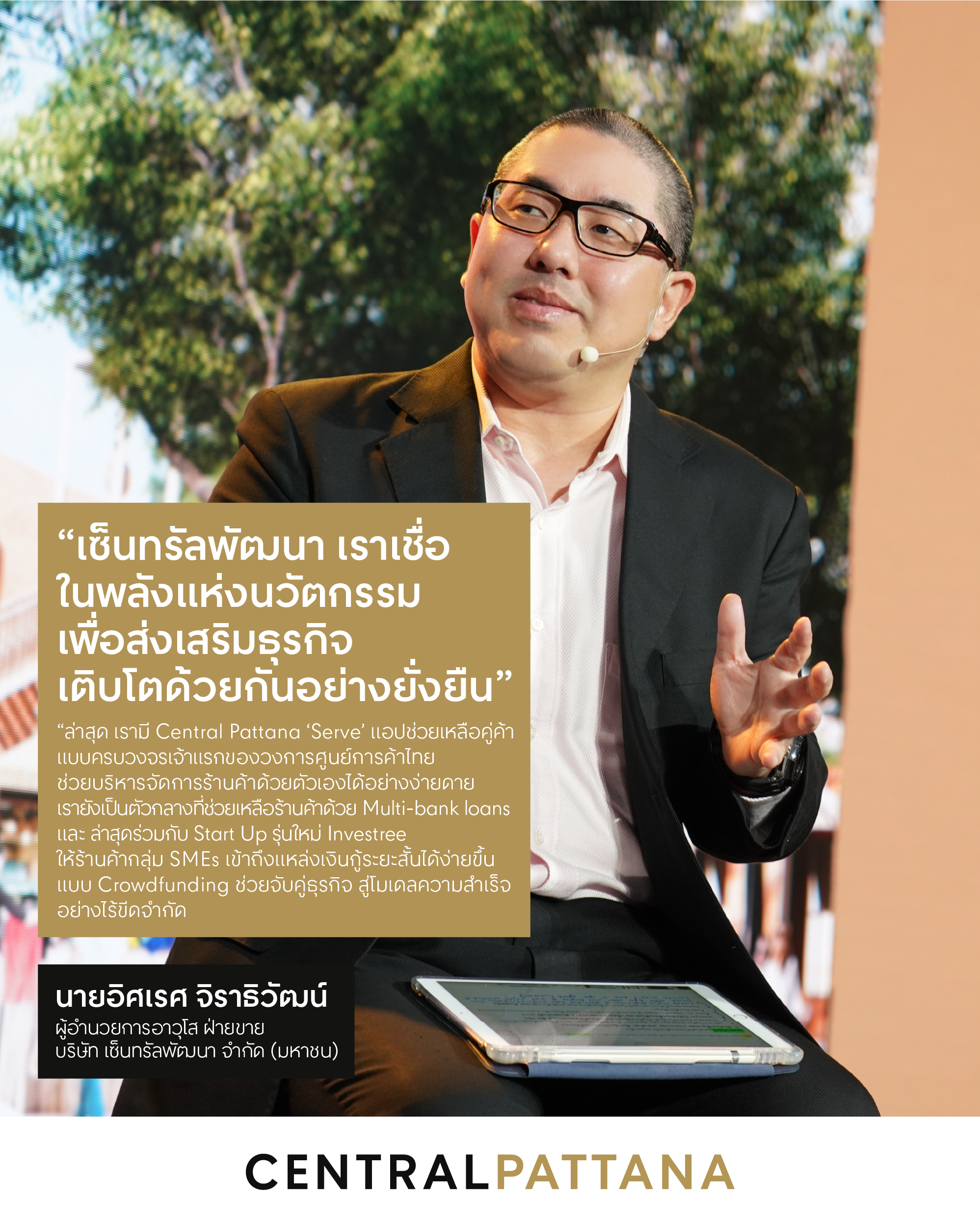 บริษัท เซ็นทรัลพัฒนา จำกัด (มหาชน) ผู้บริหารศูนย์การค้าเซ็นทรัลเวิลด์, เซ็นทรัลพลาซา, เซ็นทรัลเฟสติวัล, เซ็นทรัล ภูเก็ต และเซ็นทรัล วิลเลจ ลักชัวรีเอาต์เลตแห่งแรกของไทย เชื่อในพลังแห่งนวัตกรรมที่มาพร้อมการดูแลคู่ค้าอย่างยั่งยืน เปิดตัว CentralPattana ‘Serve’ Application แอพพลิเคชั่นดูแลอำนวยความสะดวกให้คู่ค้าแบบครบวงจรเจ้าแรกในวงการศูนย์การค้าไทย เดินหน้าผนึกกำลังและจับคู่ธุรกิจแบบ Business Matching พันธมิตรทุกระดับในรูปแบบต่างๆ สร้างและแสวงหาโอกาสใหม่ๆ สร้างความสำเร็จได้อย่างไร้ขีดจำกัด พร้อมเพิ่มโอกาสให้ SMEs ไทยเข้าถึงแหล่งทุนง่ายขึ้น โดยจับมือกับสตาร์ทอัพรุ่นใหม่ บริษัท อินเวสทรี (ไทยแลนด์) จำกัด (“อินเวสทรี“) ผู้ให้บริการ Crowdfunding Platform ที่ได้รับความเห็นชอบจาก ก.ล.ต.ช่วยแก้ปัญหาสภาพคล่องให้กลุ่มเอสเอ็มอีที่จดทะเบียนเป็นนิติบุคคล ไม่ต้องใช้หลักทรัพย์ค้ำประกัน เพียงแค่ใช้ใบแจ้งหนี้การค้าหรือสัญญากับเซ็นทรัลพัฒนา