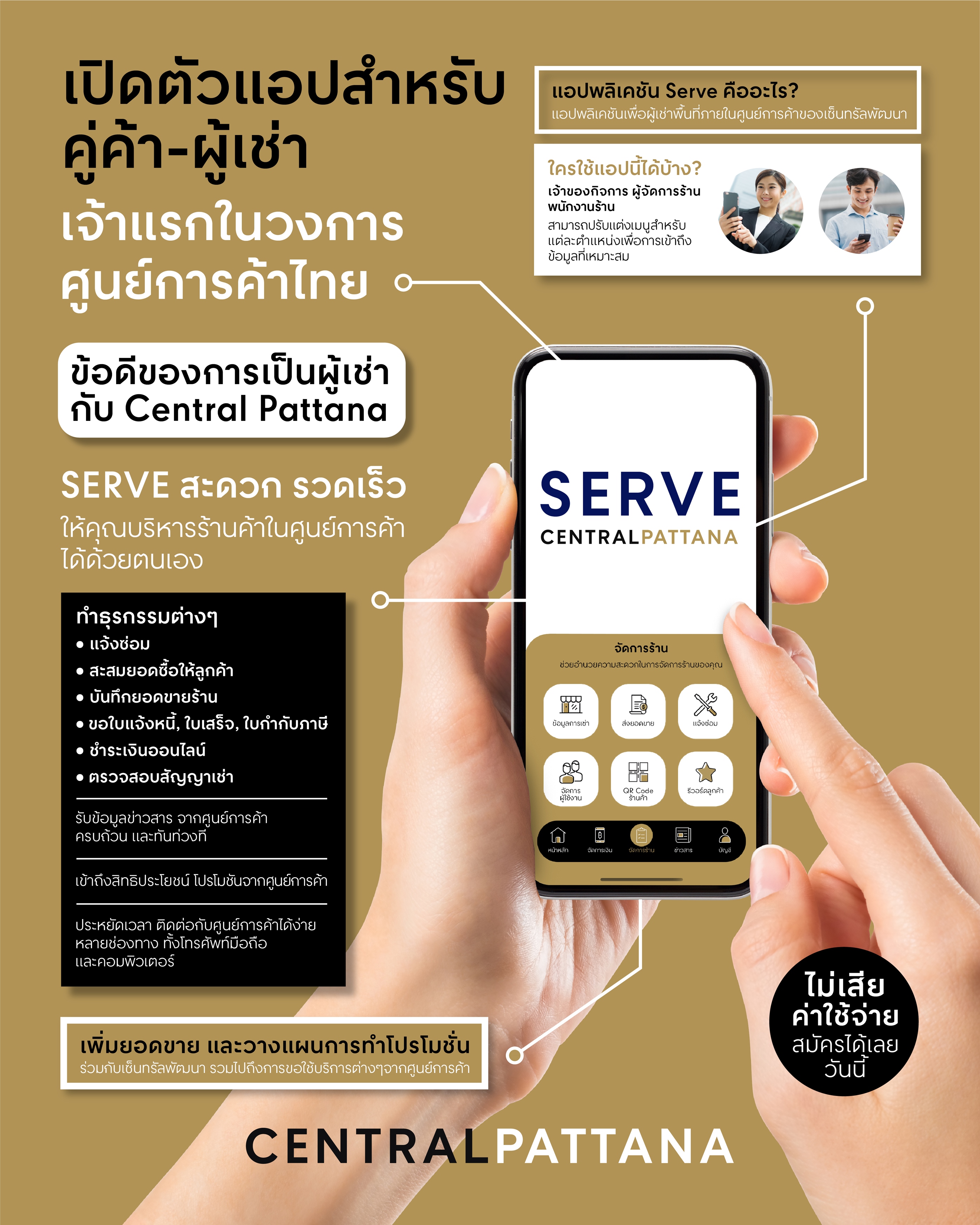 นายอิศเรศ จิราธิวัฒน์ ผู้อำนวยการอาวุโส ฝ่ายขาย บริษัท เซ็นทรัลพัฒนา จำกัด (มหาชน) เผยว่า “ตลอดมาเซ็นทรัลพัฒนา ดูแลคู่ค้าผู้ประกอบการกว่า 15,000 ราย เป็นอย่างดี เราพยายามนำเอา pain-point ต่างๆ ของผู้เช่า มาปรับให้เป็น gain-point ด้วยการใช้นวัตกรรม หรือ innovation ใหม่ๆ เพื่อส่งเสริมธุรกิจให้เติบโตไปได้ด้วยกันอย่างอย่างยั่งยืน ล่าสุดเราได้เปิดตัว Central Pattana ‘Serve’ Application แอพพลิเคชั่นเพื่อช่วยเหลือคู่ค้าแบบครบวงจรเจ้าแรกของวงการศูนย์การค้าไทย เพื่ออำนวยความสะดวกให้แก่ผู้เช่า สะดวก รวดเร็ว โดยศูนย์การค้าเซ็นทรัล เป็นศูนย์การค้าแห่งเดียวในไทย ที่มี Application & Solution รูปแบบดังกล่าว เพื่อให้การบริหารจัดการร้านค้าในพื้นที่เป็นไปได้อย่างง่ายดายได้ด้วยตัวเอง ทั้งติดต่อศูนย์การค้า ทำธุรกรรม รับข้อมูลข่าวสาร เข้าถึงสิทธิประโยชน์ต่างๆ เพื่อความสะดวกสบายในการทำธุรกิจ รวมถึงเตรียมเปิดตัวโปรแกรม The 1 Biz : Effective CRM เพิ่มยอดขายให้คู่ค้าและแผนสนับสนุนต่อเนื่องทั้งปี และเพิ่มการเข้าถึงกลุ่มลูกค้ามากยิ่งขึ้น”